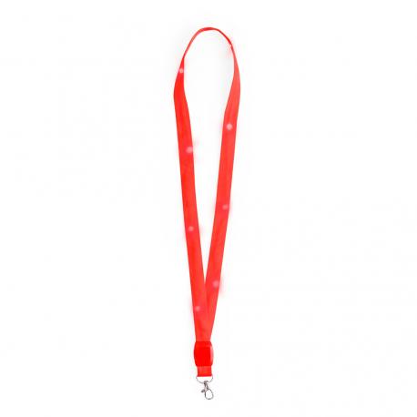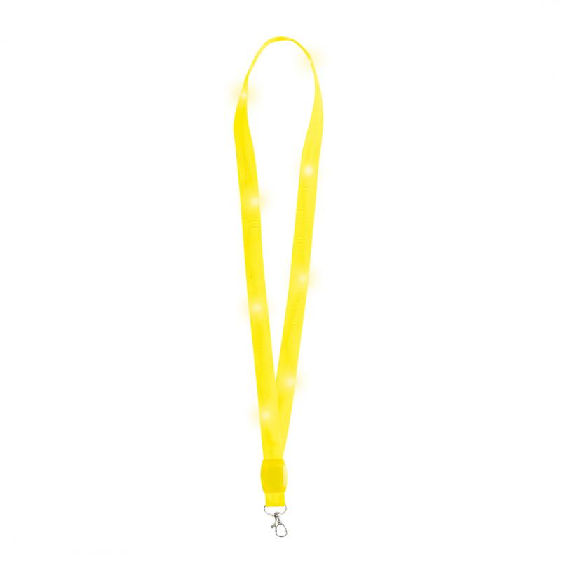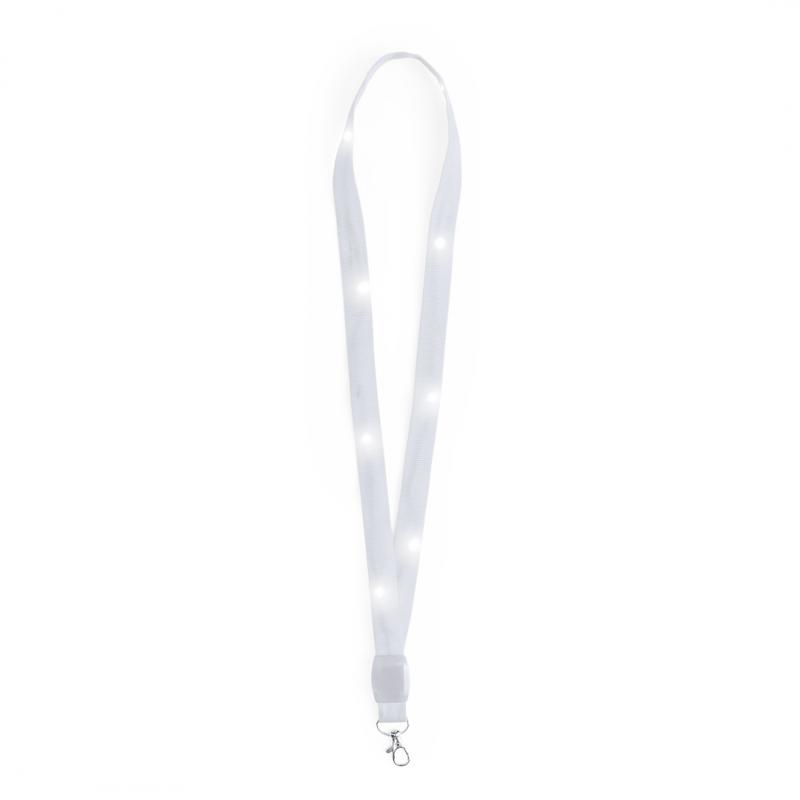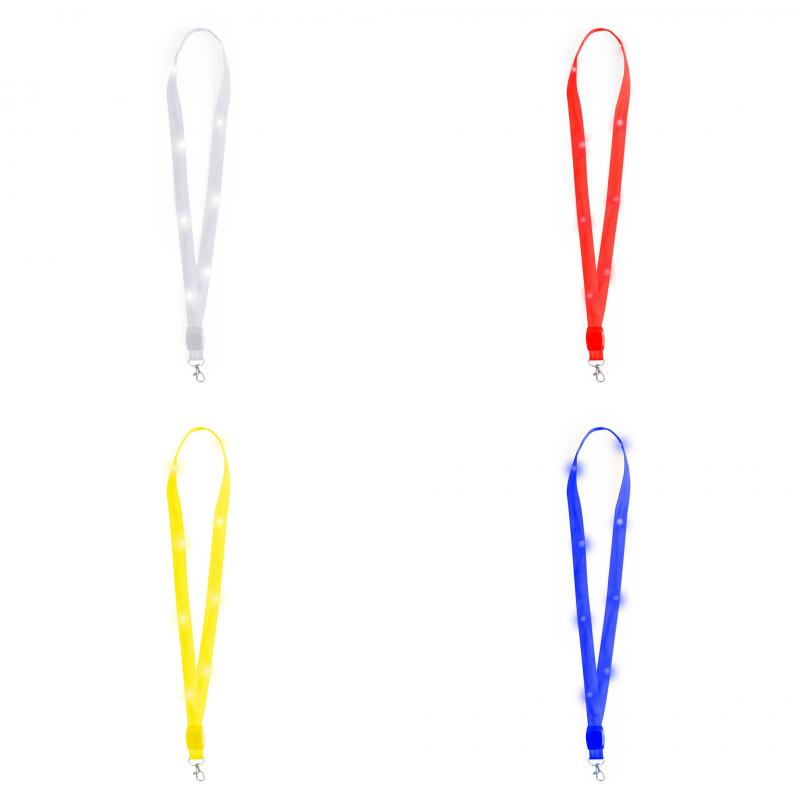 Original lanyard con luces LEDs. Divertido cordón para cuello que contiene en su interior 8 LEDs alimentadas por pilas de botón (incluidas), con su discreto interruptor se puede poner en tres posiciones (luz fija, luz intermitente rápida o lenta). Disponible en varios colores. Con práctico gancho giratorio.