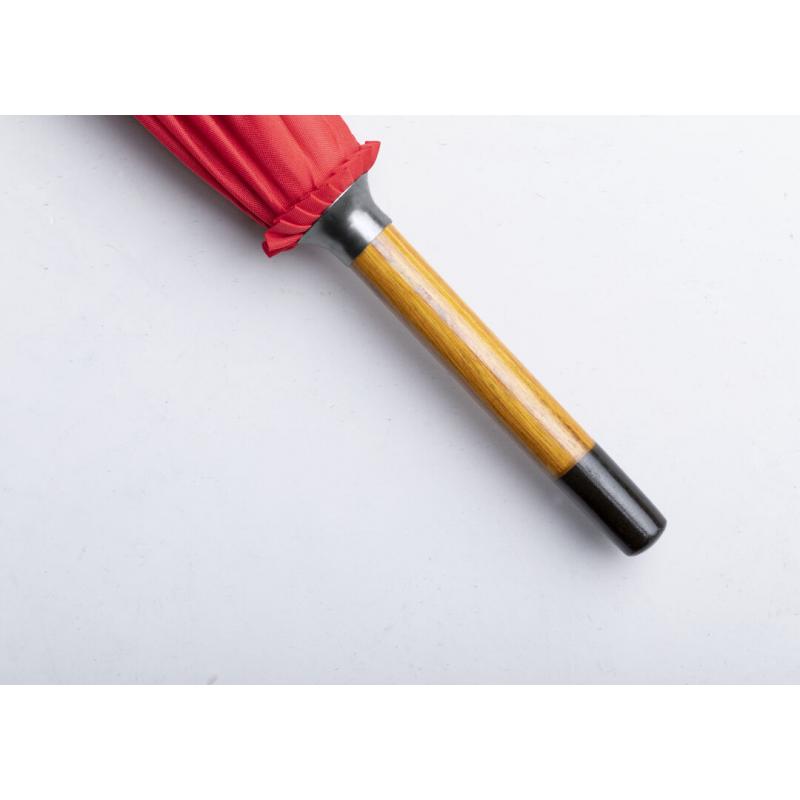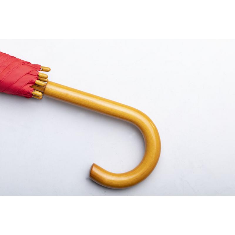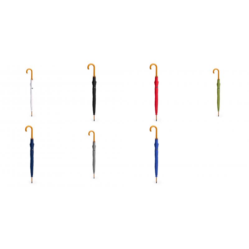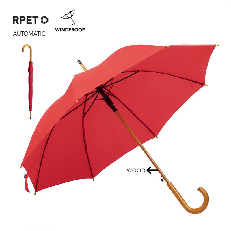 Paraguas de línea nature de 105cm de diámetro. En material pongee 190T RPET, elaborado a partir de plástico reciclado, para así fomentar la reutilización de residuos plásticos y ayudar a la sostenibilidad del planeta. De apertura automática y varillas metálicas. Mango y caña de madera, con etiqueta distintiva RPET