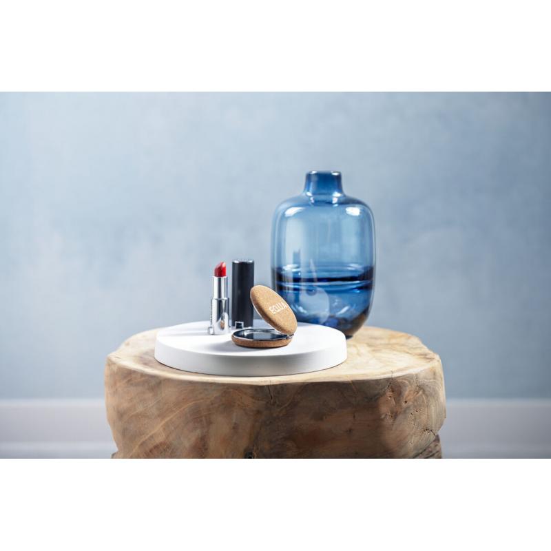 Espejo plegable de línea nature. En combinación de materiales corcho natural y metal cromado. Dos espejos interiores: 1X / 2X. Presentado en atractiva caja individual de diseño eco.
