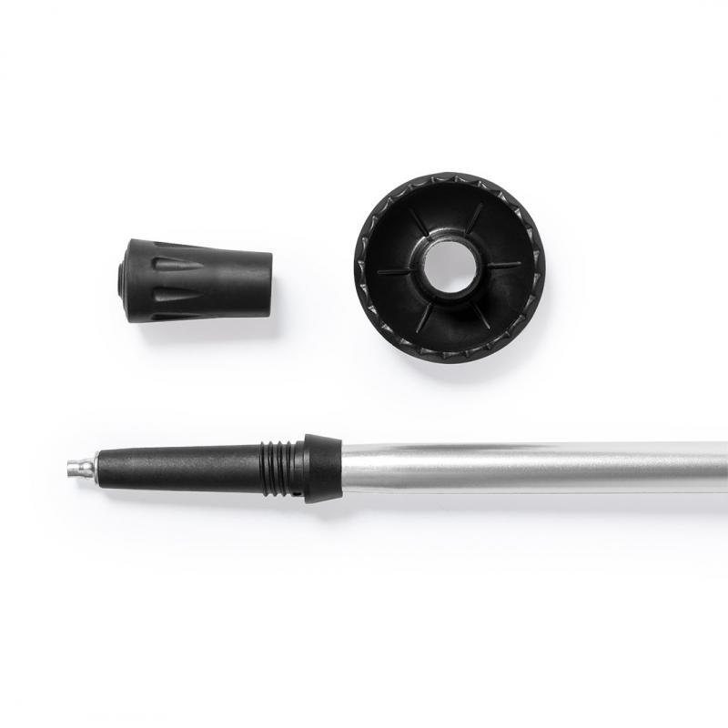 Bastón deportivo plegable y telescópico. Fabricado en resistente aluminio, con confortable mango ergonómico en corcho natural y accesorio de espuma para descansar las manos. Mecanismo de amortiguación, con refuerzo antideslizante en el extremo en contacto con el suelo y cinta de seguridad ajustable. Regulable en altura, incluye accesorio para nieve y viene presentado en funda de transporte en color natural, con cinta para hombro para fácil transporte y cierre en color negro.
