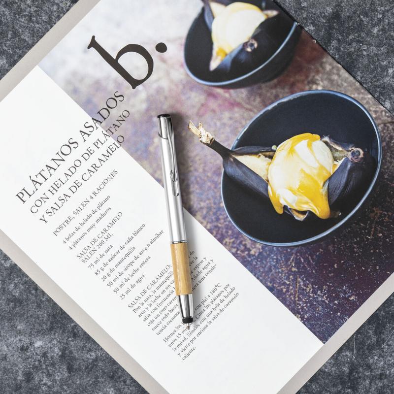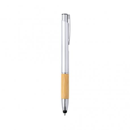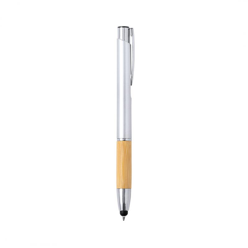 Elegante bolígrafo puntero de línea nature y mecanismo pulsador. Cuerpo en resistente ABS de acabado brillo y empuñadura en bambú, con accesorios a juego. Clip metálico, con cartucho jumbo y en tinta azul.