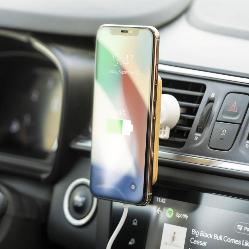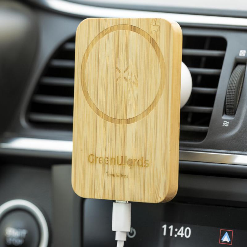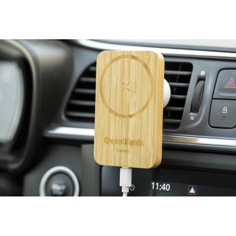 Soporte de rejilla de coche para smartphone de línea nature y fabricado en bambú. Con cargador inalámbrico 15W integrado y fijación magnética para poder usar el dispositivo mientras se está cargando. Incluye anillo adhesivo, siendo válido para todos los dispositivos con tecnología Magsafe y Qi. Presentado en caja individual de diseño eco en cartón kraft.