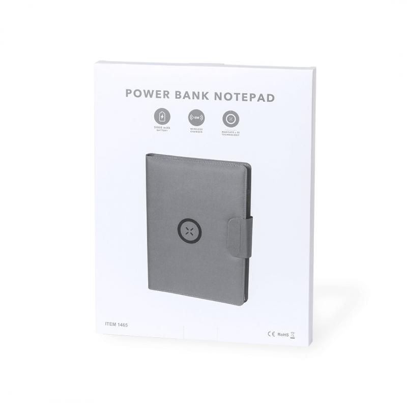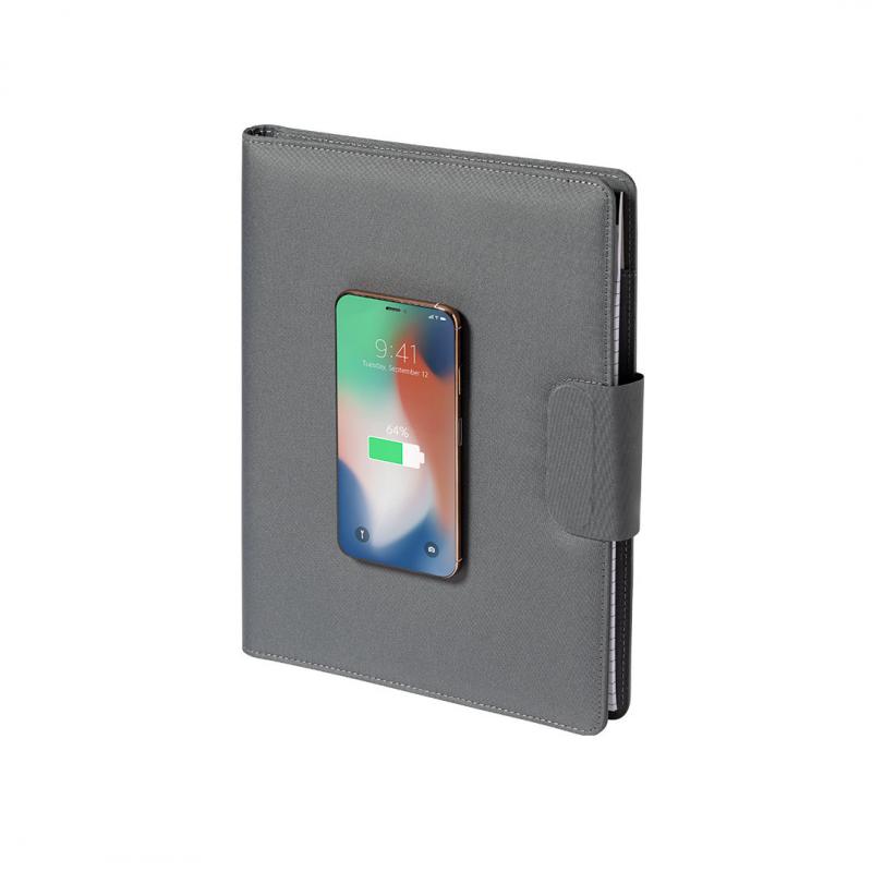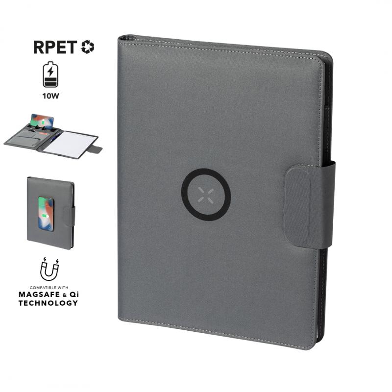 Carpeta/bloc multifunción fabricada en poliéster 300D RPET, elaborado a partir de plástico reciclado, para así fomentar la reutilización de residuos plásticos y ayudar a la sostenibilidad del planeta. Con cierre magnético y etiqueta interior con distintivo RPET. Incluye cargador inalámbrico 10W integrado en portada, con fijación magnética para poder usar el dispositivo mientras se produce la carga del mismo e incluyendo anillo adhesivo, válido para todos los dispositivos con tecnología Magsafe y Qi. Batería integrada de 5.000 mAh de capacidad de carga, con puerto Tipo C de entrada/salida y LEDs indicadores de estado de carga, con cable incluido. Interior con soporte para smartphone y multitud de compartimentos para tarjetas, incluidos soporte para bolígrafo y bloc A4 con 20 hojas de disposición a una raya. Presentada en atractiva caja individual de diseño. Las capacidades mostradas en todas nuestras baterías auxiliares externas son reales, incorporando todas ellas baterías de grado A y no recicladas, con una vida útil de al menos 500 ciclos de carga y según normativa CE. Además, están fabricadas conforme a los estándares RoHS y en cumplimiento con los siguientes requisitos de seguridad: Sistema de protección contra sobrecarga del power bank. Sistema de protección contra descarga completa que proporciona una mayor durabilidad del power bank. Sistema de bloqueo para evitar cortocircuitos. Sistema de transferencia de carga constante, acorde con la capacidad del dispositivo de destino.