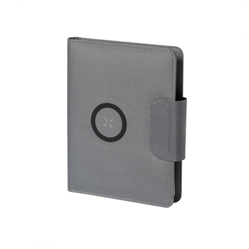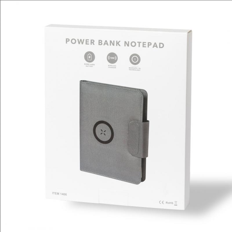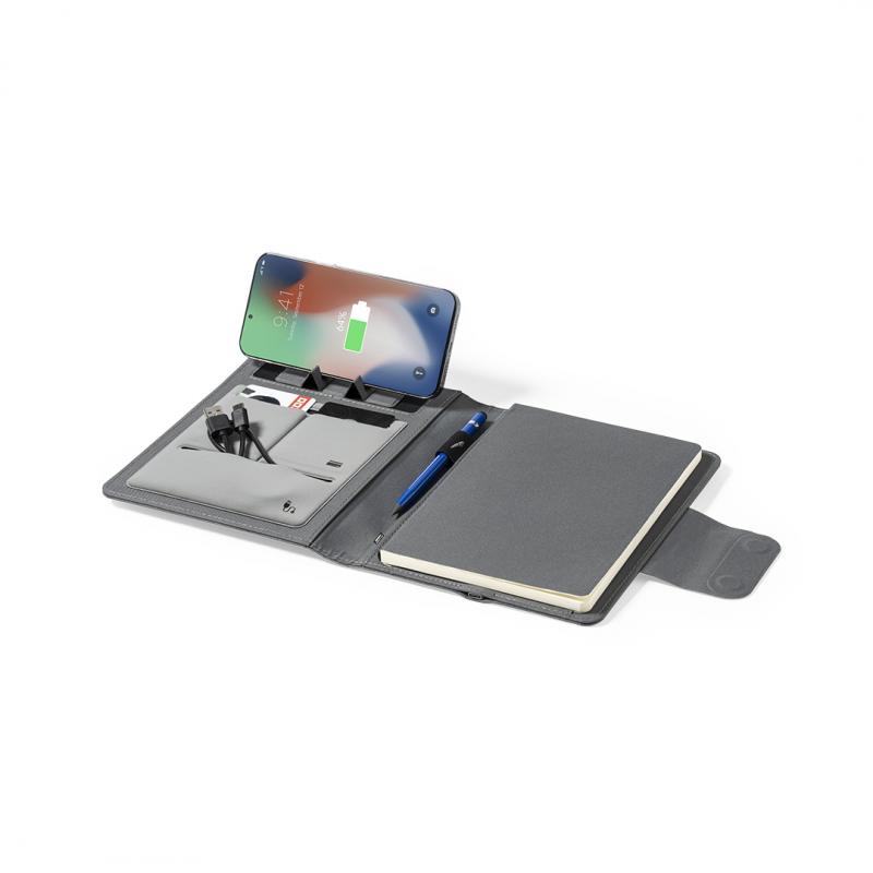 Carpeta/bloc multifunción fabricada en poliéster 300D RPET, elaborado a partir de plástico reciclado, para así fomentar la reutilización de residuos plásticos y ayudar a la sostenibilidad del planeta. Con cierre magnético y etiqueta interior con distintivo RPET. Incluye cargador inalámbrico 10W integrado en portada, con fijación magnética para poder usar el dispositivo mientras se produce la carga del mismo e incluyendo anillo adhesivo, válido para todos los dispositivos con tecnología Magsafe y Qi. Batería integrada de 5.000 mAh de capacidad de carga, con puerto Tipo C de entrada/salida y LEDs indicadores de estado de carga, con cable incluido. Interior con soporte para smartphone y multitud de compartimentos para tarjetas, incluidos soporte para bolígrafo y bloc A5 con 65 hojas de disposición a una raya. Presentada en atractiva caja individual de diseño. Las capacidades mostradas en todas nuestras baterías auxiliares externas son reales, incorporando todas ellas baterías de grado A y no recicladas, con una vida útil de al menos 500 ciclos de carga y según normativa CE. Además, están fabricadas conforme a los estándares RoHS y en cumplimiento con los siguientes requisitos de seguridad: Sistema de protección contra sobrecarga del power bank. Sistema de protección contra descarga completa que proporciona una mayor durabilidad del power bank. Sistema de bloqueo para evitar cortocircuitos. Sistema de transferencia de carga constante, acorde con la capacidad del dispositivo de destino.