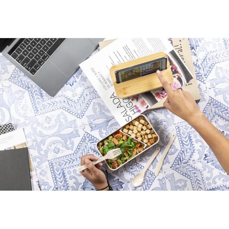 Original set de fiambreras de 1,4l en resistente material PP veteado libre de BPA. Original tapa de bambú con soporte para smartphone integrado. Dos compartimentos, cada uno de 700 ml de capacidad y compartimento interior con tenedor, cuchara y cuchillo. Incluye cinta de seguridad exterior. Certificación Food Grade, garantizando la seguridad cuando los alimentos entran en contacto con el material usado para fabricar el producto.