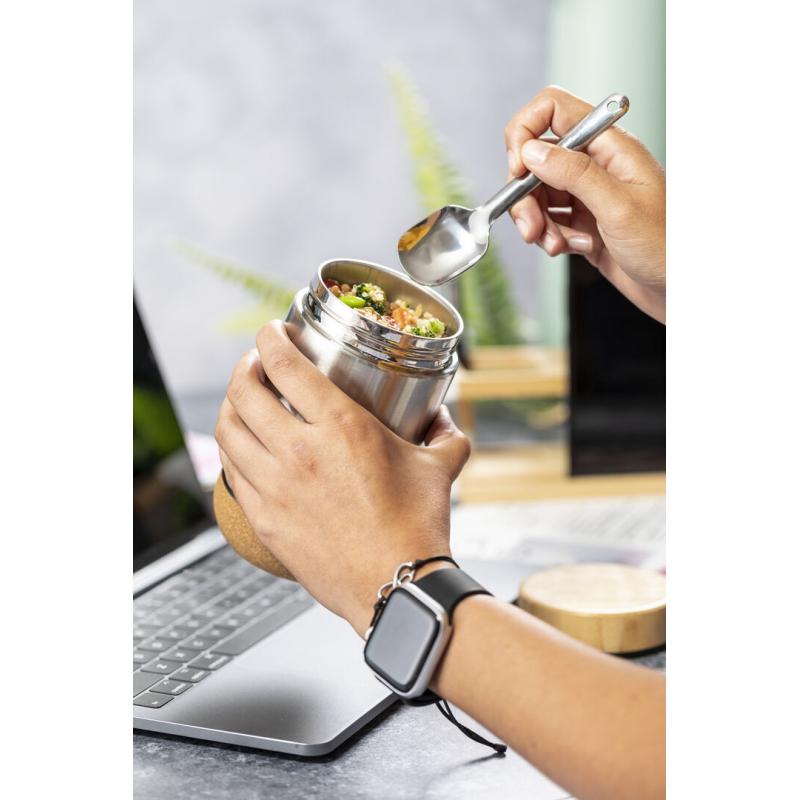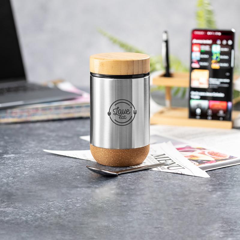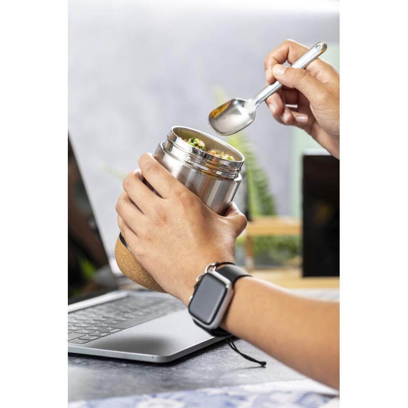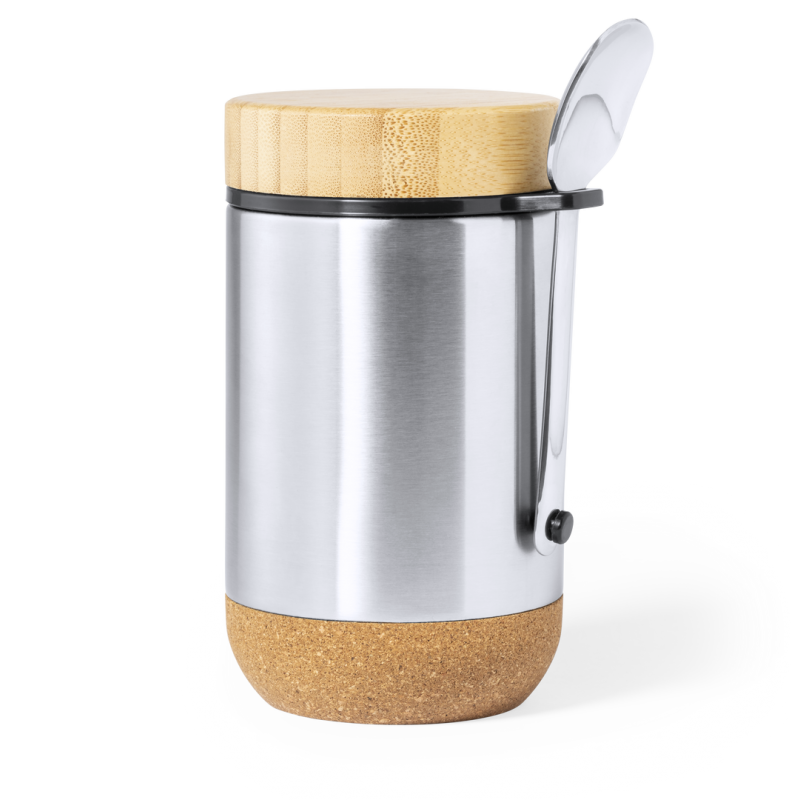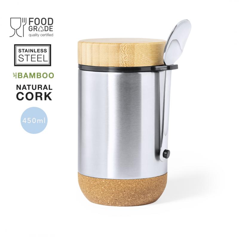 Fiambrera de línea nature y 450 ml de capacidad. Cuerpo en acero inox, con base de corcho para mantener la temperatura y tapón de seguridad en bambú, con accesorio de fijación para la cuchara de acero inox (incluida). Presentada en caja individual de diseño eco en cartón kraft.