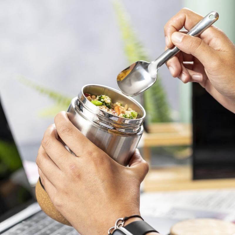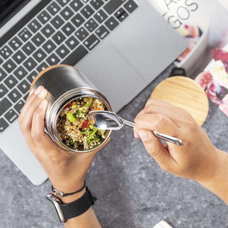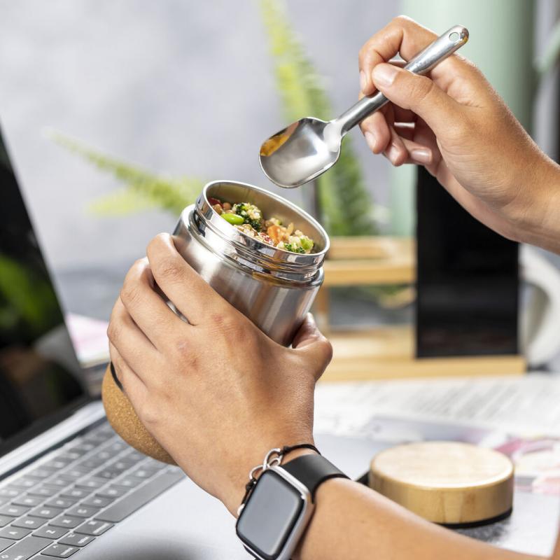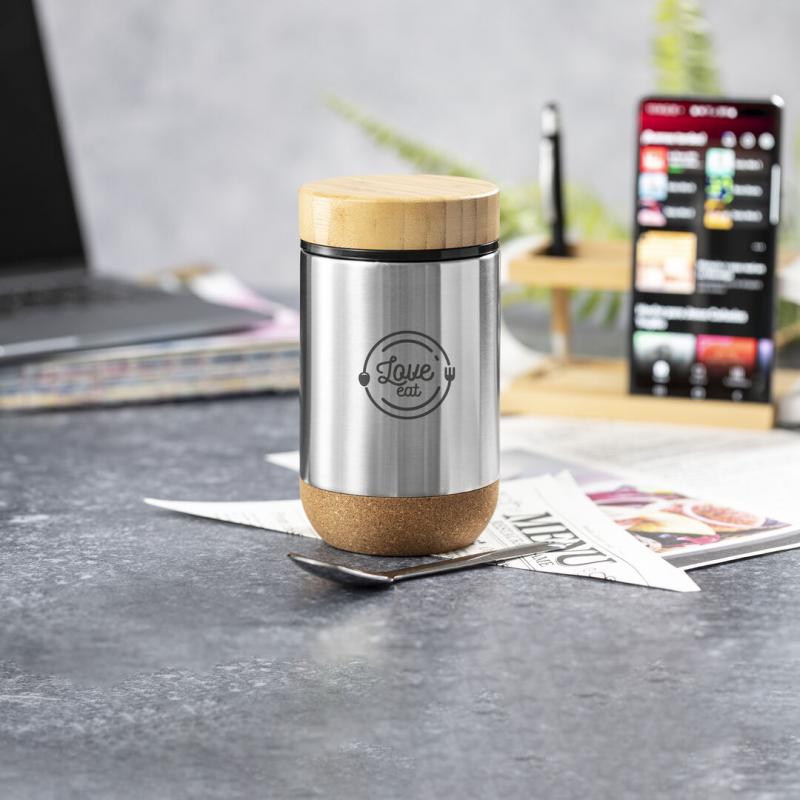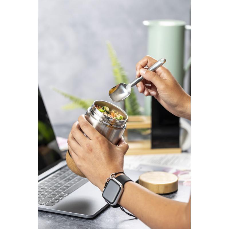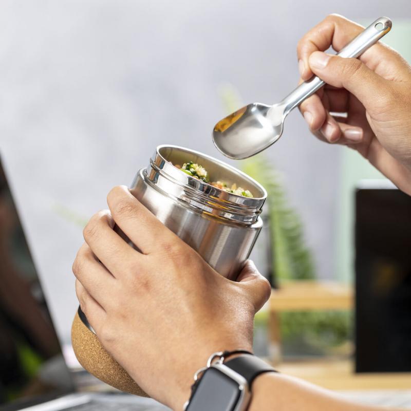 Fiambrera de línea nature y 450 ml de capacidad. Cuerpo en acero inox, con base de corcho para mantener la temperatura y tapón de seguridad en bambú, con accesorio de fijación para la cuchara de acero inox (incluida). Presentada en caja individual de diseño eco en cartón kraft.