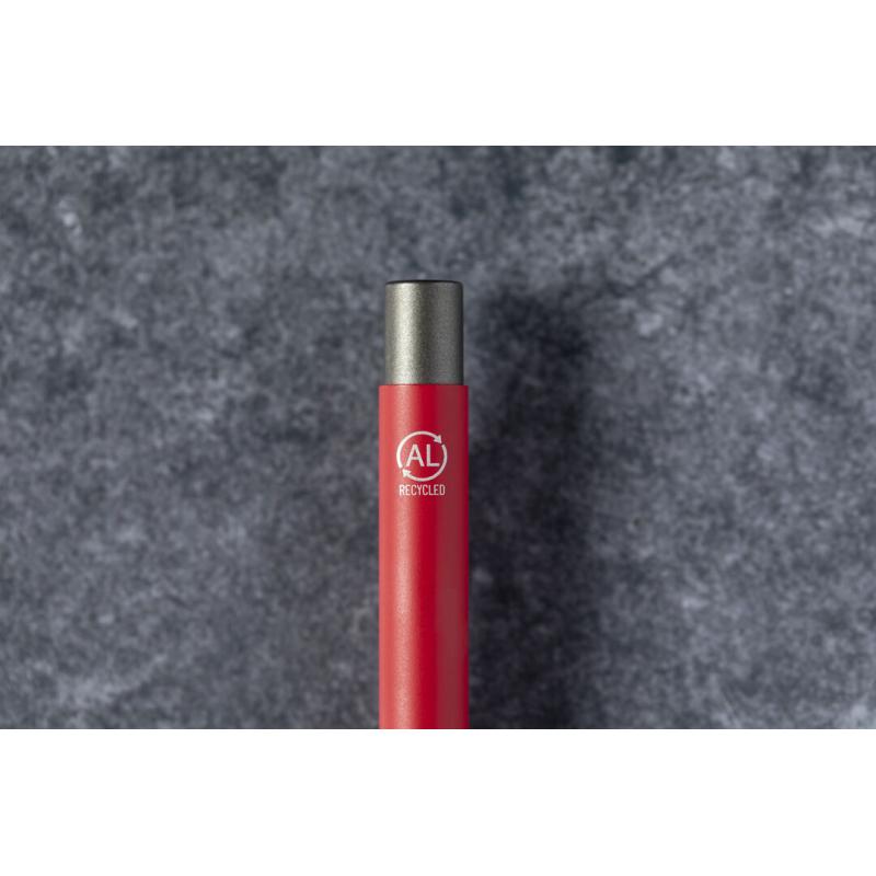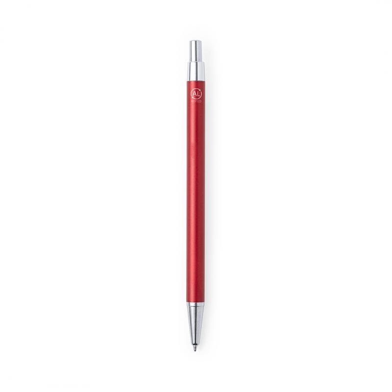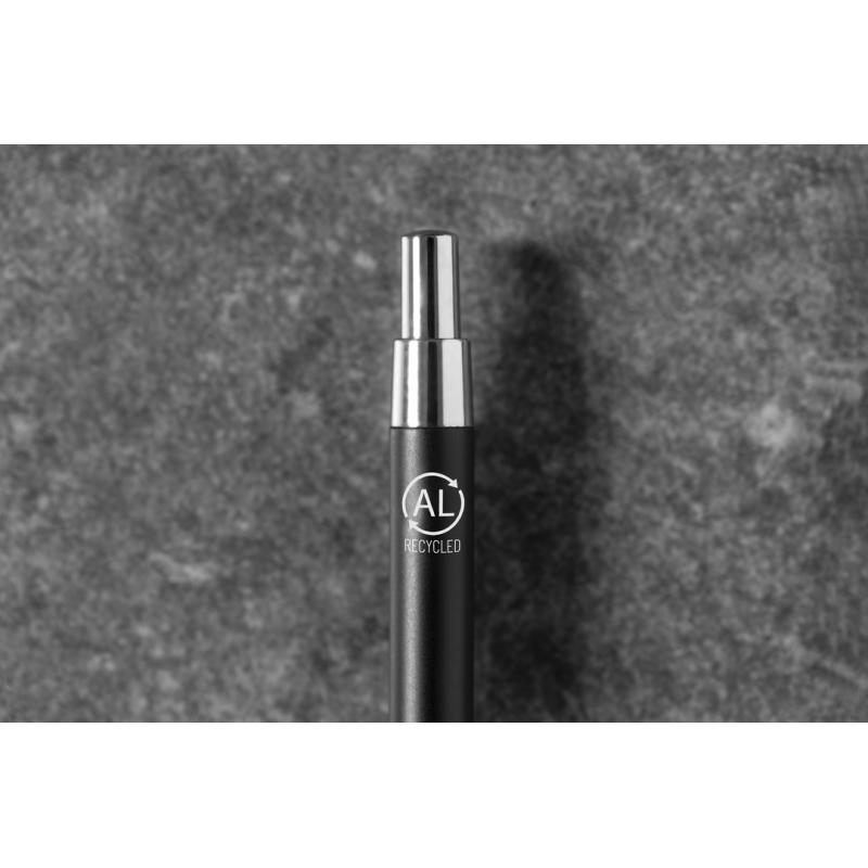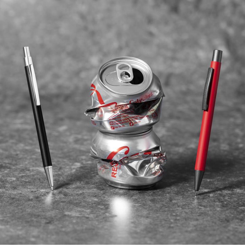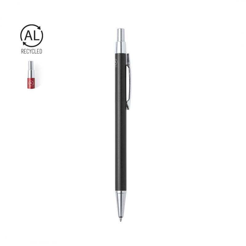 Bolígrafo eco-friendly fabricado en aluminio reciclado, cuyo origen se encuentra en la reutilización casi infinita de uno de los materiales con mayor potencial de reciclabilidad sin perder sus propiedades. Esta característica lo convierte en un material eco-friendly de origen reciclado, fácilmente reciclable y de cuyos procesos de tratamiento y desechos para la obtención del material se pueden obtener nuevos recursos reutilizables, consumiendo menos energía en su fabricación, entre otros factores de sostenibilidad. De mecanismo pulsador, con cuerpo disponible en variada gama de colores metalizados y accesorios en cromado. Con clip metálico, tinta azul y distintivo aluminio reciclado en la parte superior del bolígrafo. Certificación GRS (Global Recycled Standard / Estándar de Reciclaje Global), que garantiza el origen reciclado del material usado para fabricar el producto.