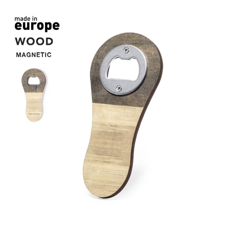 Abridor magnético fabricado en madera natural y de original acabado bicolor. Con mecanismo de apertura metálico, amplia superficie de marcaje y distintivo Made In Europe.