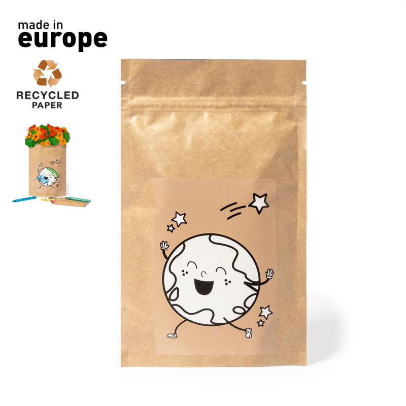 Maceta de línea nature con semillas de capuchina. Presentada en sobre de papel reciclado de diseño, con caja interior de 6 ceras para colorear en estuche de cartón reciclado. Un gadget ecológico que combina el cuidado del medio ambiente con la diversión de colorear.