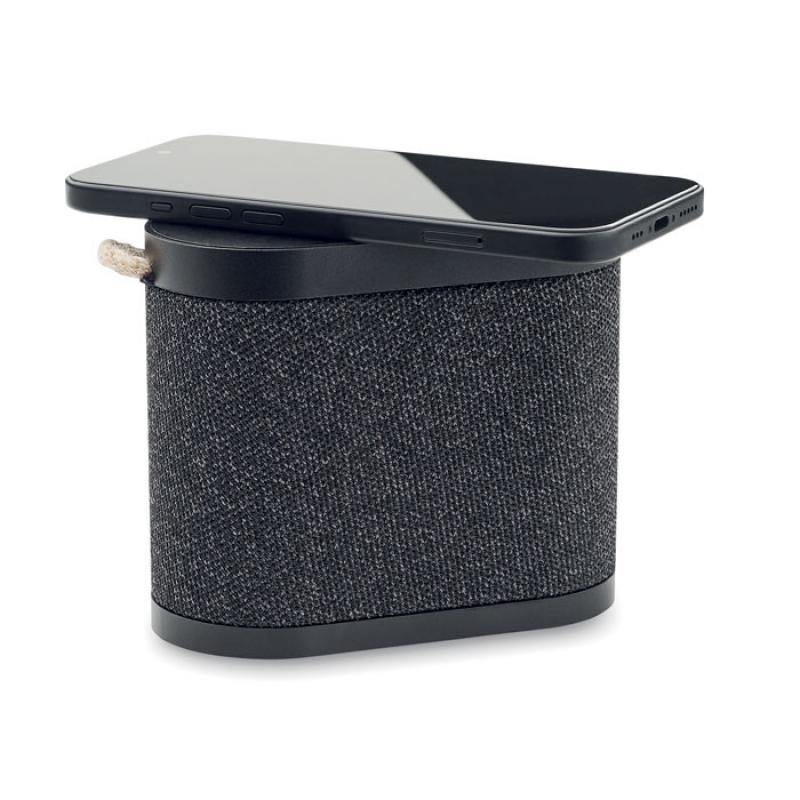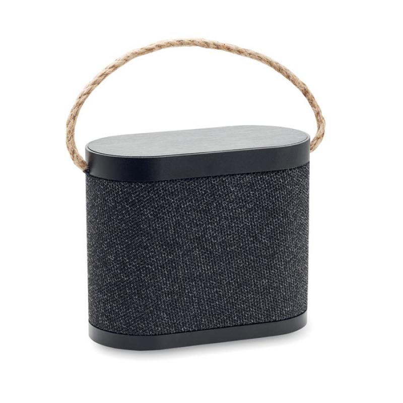 Altavoz inalámbrico 5.3 de 15 W en ABS con acabado en tejido de poliéster RPET y parte superior de bambú con asa de yute. Batería recargable de iones de litio de 1200 mAh. Datos de salida: 5W, 4 Ohm y 5V. Tiempo de reproducción aprox. 4h.Recipiente :