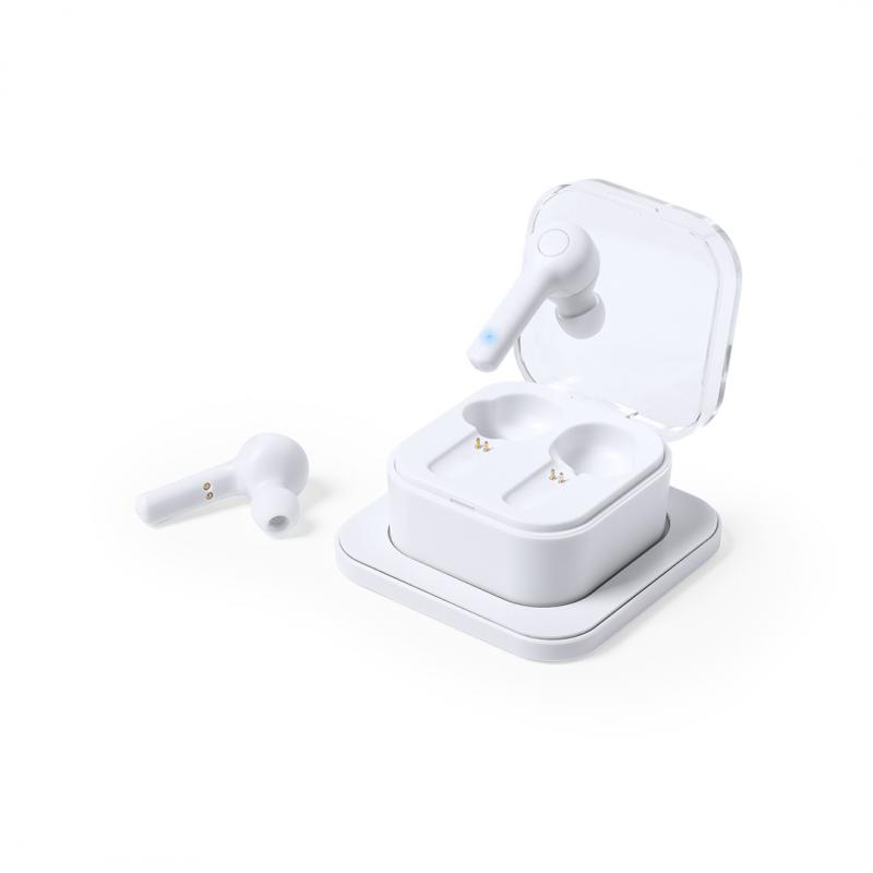 Auriculares intraurales Bluetooth® 5.0 con base de carga inalámbrica 5w, Compatible con dispositivos equipados con tecnología de carga inalámbrica. En elegante acabado de color blanco y de diseño ergonómico. Incluyen botón de control integrado en el auricular y cuentan con batería de litio. Base de carga a juego y luz LED de estado de carga. Función manos libres y recargables, con cable de carga incluido. Presentados en estuche individual de lujo con tapa de bisagra y en atractiva caja individual de diseño.