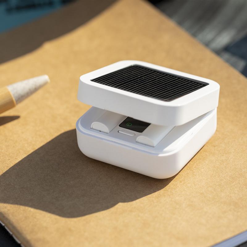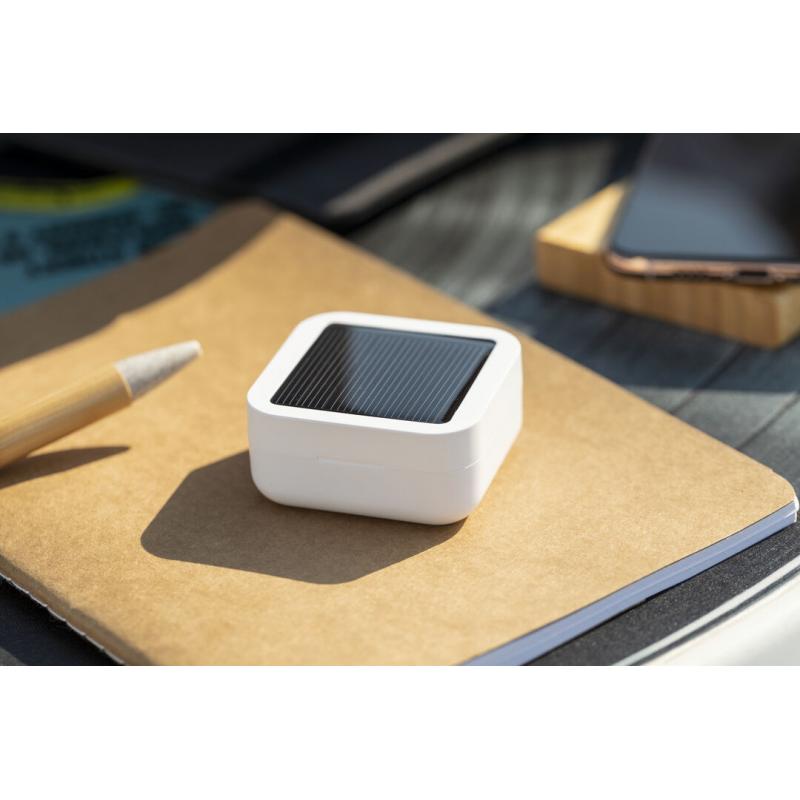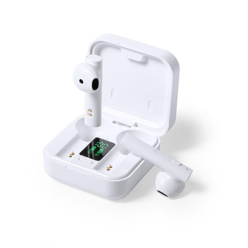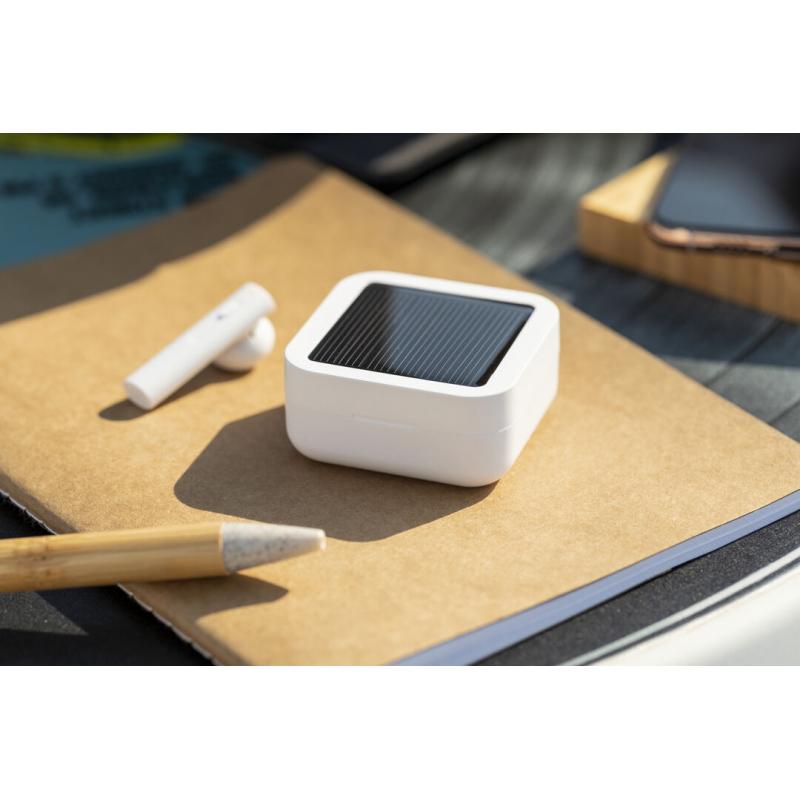 Auriculares intraurales en elegante acabado blanco y conexión Bluetooth® 5.0. Con panel de carga solar integrado en la tapa y pantalla LCD interior con indicador de estado de carga. De diseño ergonómico, incluyen botón de control integrado en el auricular, con base a juego. Función manos libres y recargables con energía solar o mediante cable micro USB -incluido-. Presentados en estuche individual premium con apertura de bisagra y en atractiva caja de diseño, con manual de instrucciones en español e inglés.