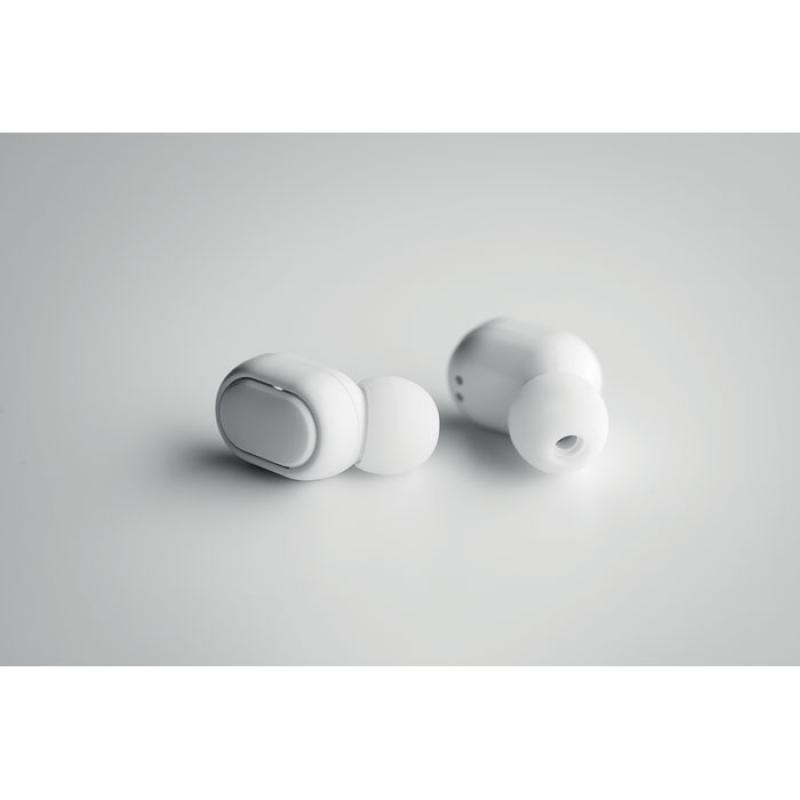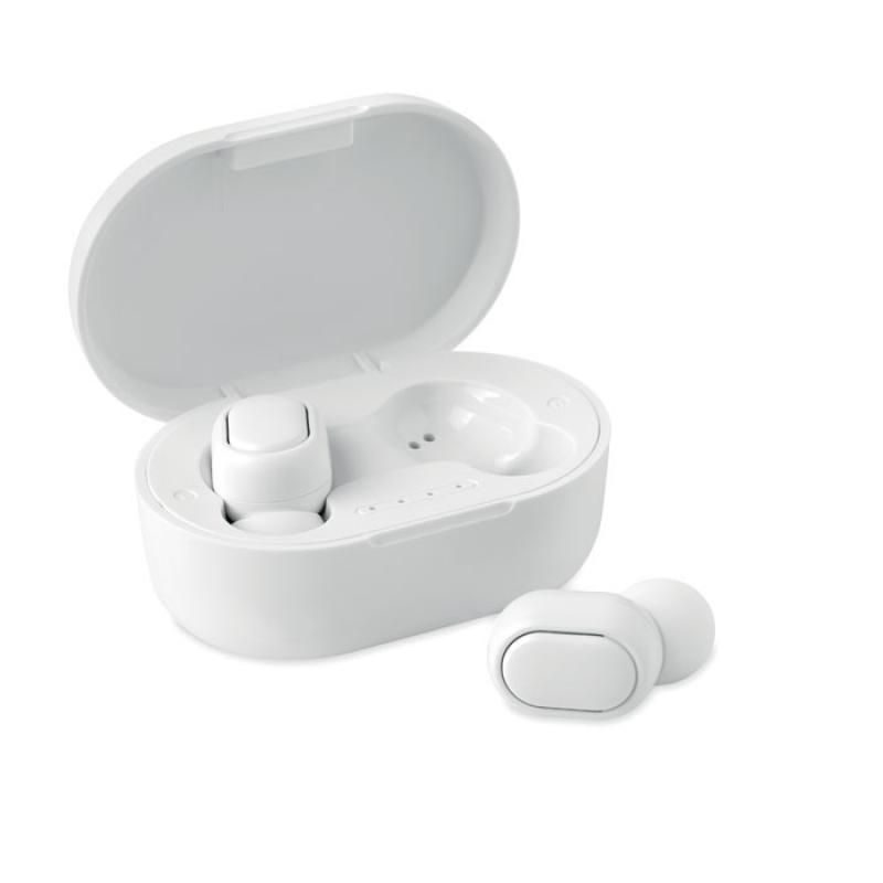 Auriculares estéreo inalámbricos True Wireless Stereo (TWS) 5.0 de ABS reciclado con batería de 40 mAh incorporada. Tiempo de reproducción de aproximada: 4 horas. Incluye un cable de carga micro USB y una estación de carga de 300 mAh.