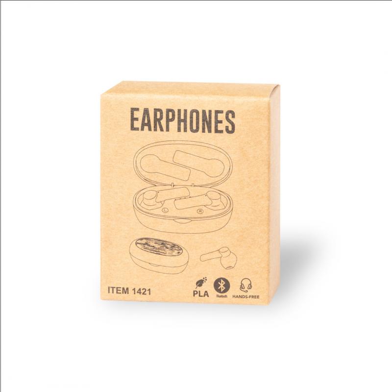 Auriculares intraurales de línea nature fabricados en resistente material PLA -Ácido PoliLáctico-, que se obtiene a partir de recursos 100% naturales como el almidón de maíz, la yuca o la caña de azúcar, pudiendo convertirse en 100% compostable al final de su ciclo de vida útil. Conexión Bluetooth® 5.0 y función manos libres, con elegante tapa en bambú. De diseño ergonómico, incluyen botón de control táctil integrado en el auricular, con base de carga a juego. Recargables, con cable Tipo C incluido. Presentados en caja individual de diseño eco en cartón kraft.