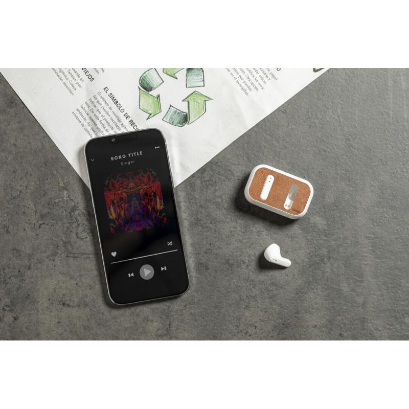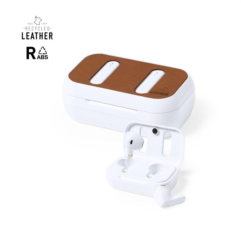 Auriculares intraurales Bluetooth®, fabricados en RABS y en elegante color blanco, con la tapa de la base de carga forrada en cuero reciclado.Conexión Bluetooth® 5.1, función manos libres y batería de 30 mAh. De diseño ergonómico, incluyen botón de control táctil integrado en cada auricular y luz LED de estado de carga. Base de carga a juego, con batería de 300mAh. Incluye cable cargador Tipo C y manual de instrucciones en español e inglés. Presentado en caja individual de diseño kraft.El material RABS o ABS Reciclado y el cuero reciclado proceden del reciclado de artículos al final de su vida útil. Los materiales reciclados empleados incorporan la certificación RCS, que garantiza el origen reciclado de los mismos.