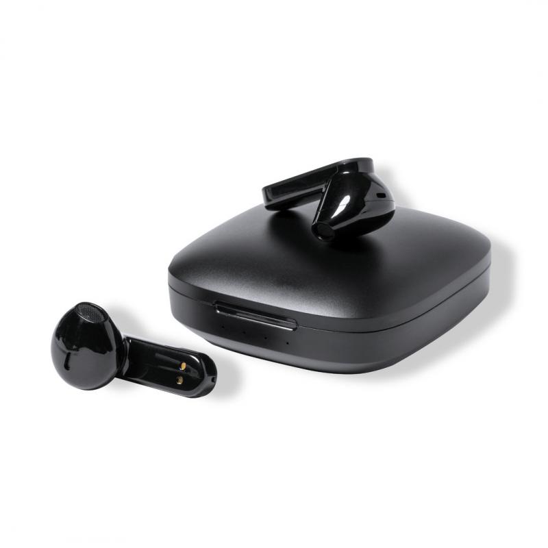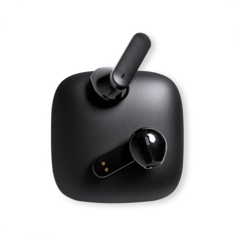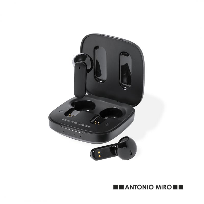 Auriculares intraurales Bluetooth de Antonio Miró, de diseño y en elegante acabado negro mate. Conexión Bluetooth® 5.0, con batería integrada de litio de 30 mAh en cada auricular. Diseño ergonómico, con botón de control táctil en el auricular y función manos libres. Base de carga a juego con logotipo de la marca, de 300 mAh de capacidad y con indicador LED de estado de carga. Cable de carga Tipo C a juego incluido y presentados en caja individual negra con logotipo Antonio Miró. Disponible manual de instrucciones en español e inglés.
