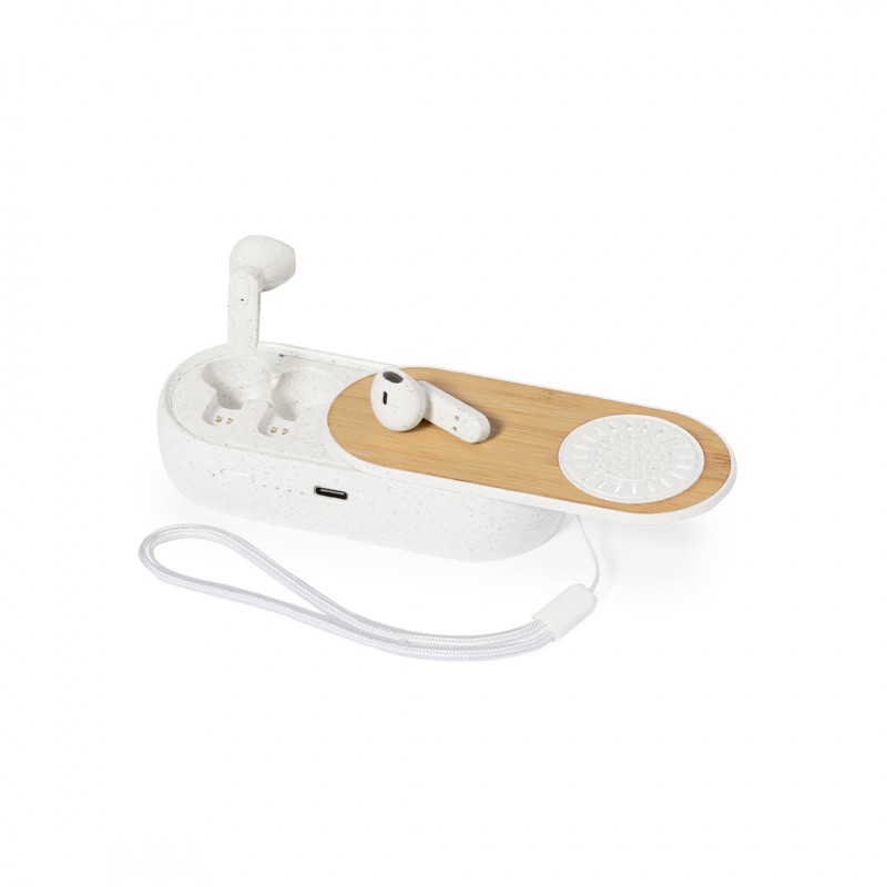 Auriculares altavoz fabricados en bambú y caña de trigo. Con Bluetooth® 5.0. Contenido:Auriculares de diseño intraulares con botón de control integrado, base de carga a juego y luz LED de estado de carga. Altavoz Bluetooth® de 3W y función manos libres.Batería recargable de 30 mAh en cada auricular y base de 300 mAh. Presentados en caja individual de diseño con manual de instrucciones en español e inglés.Elaborado con elementos vegetales para así fomentar la utilización de materias primas naturales y reducir las emisiones contaminantes.