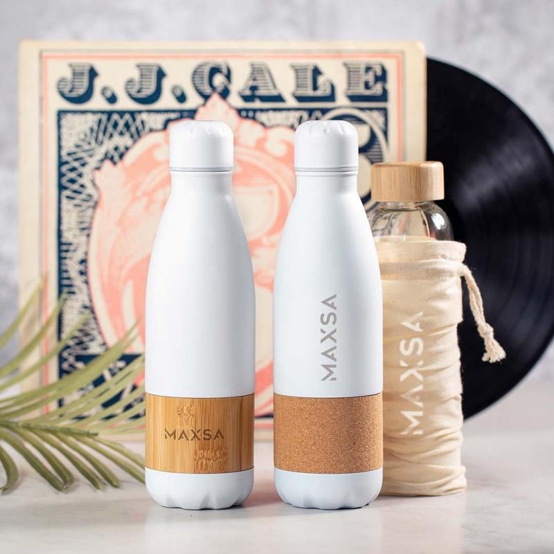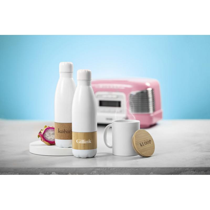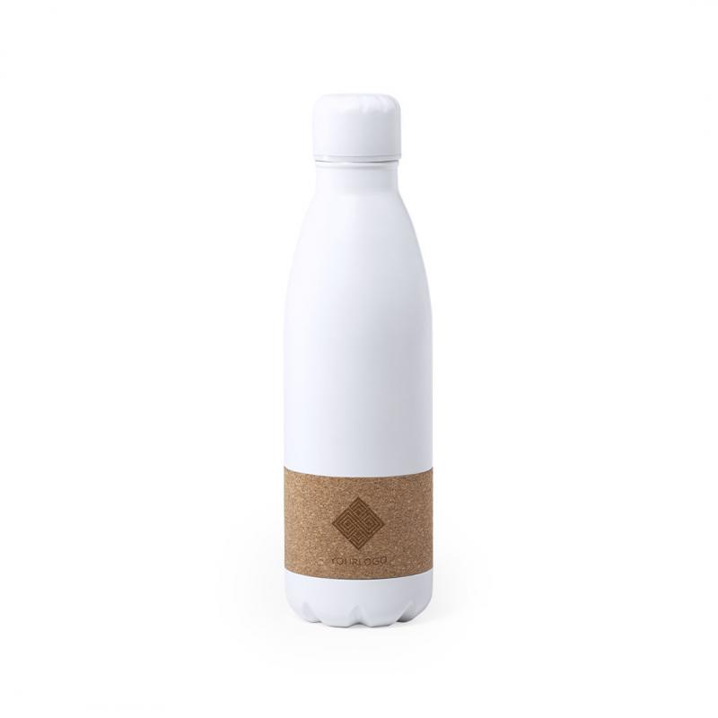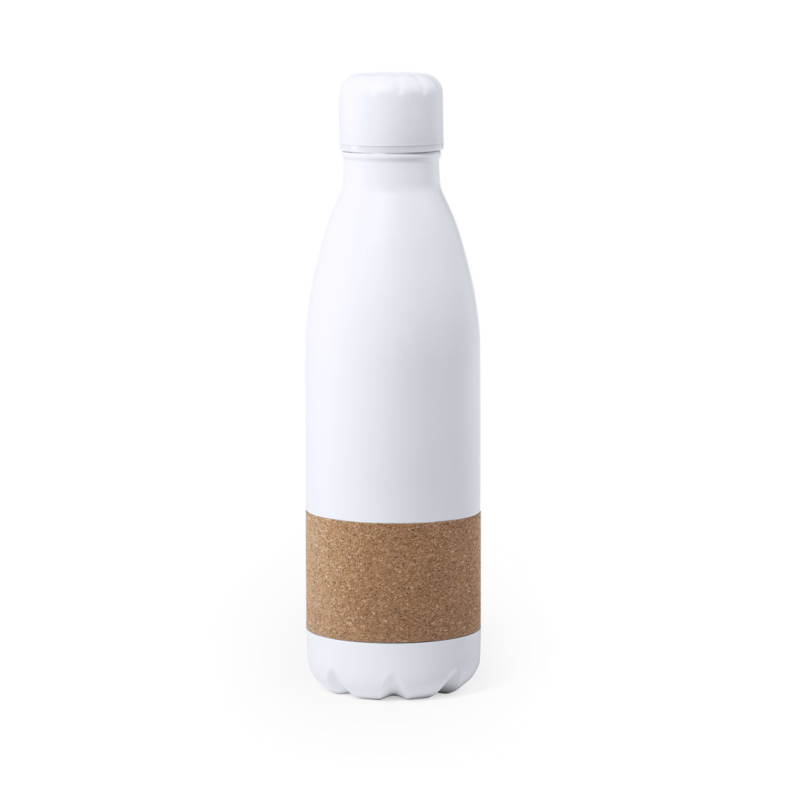 Bidón de línea nature y 750ml de capacidad. Cuerpo en acero inox de color blanco mate, con franja central en corcho natural. Tapón de seguridad de rosca a juego y presentado en atractiva caja de diseño eco.
