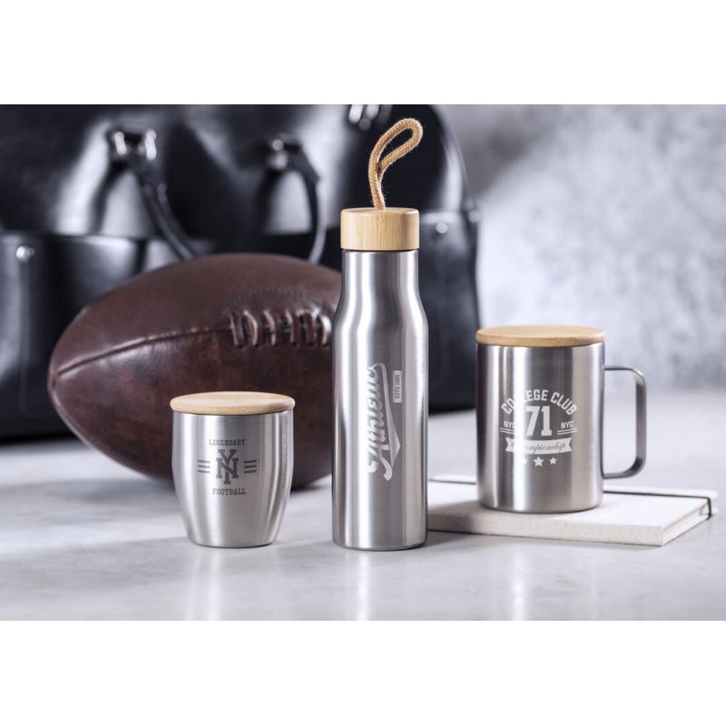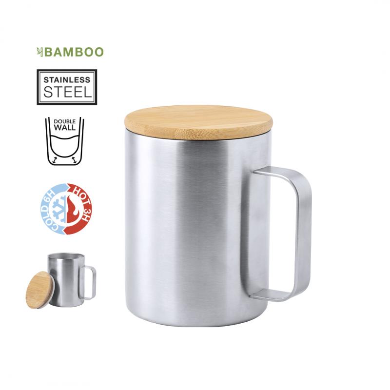 Taza de térmica de acero inox y 350ml de capacidad. Tapa fabricada en bambú y presentada en atractiva caja de diseño eco.