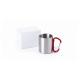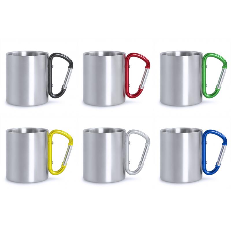 Taza de acero inox de 210ml, con cuerpo de acabado brillante metálico y una funcional asa en forma de mosquetón de colores variados pudiendo ser fácil de transportar. Presentada en una caja de cartón Kraft.