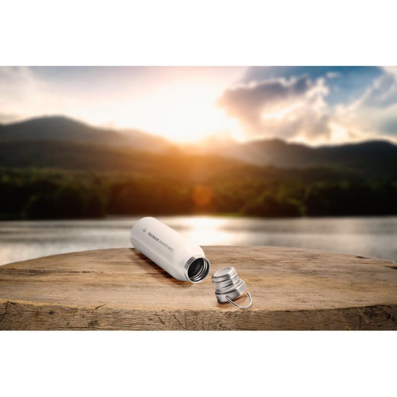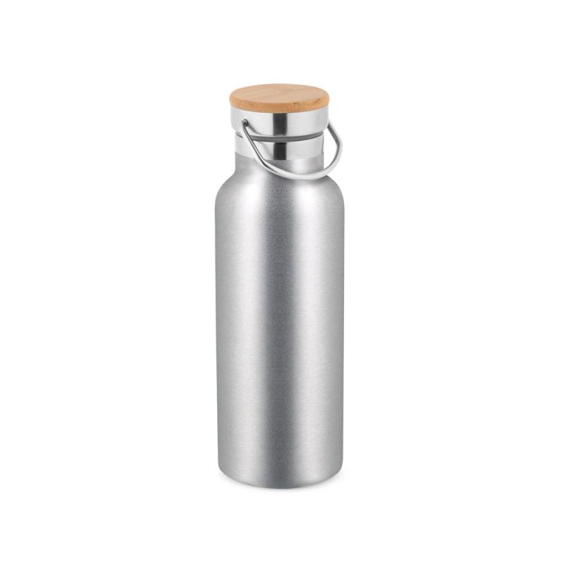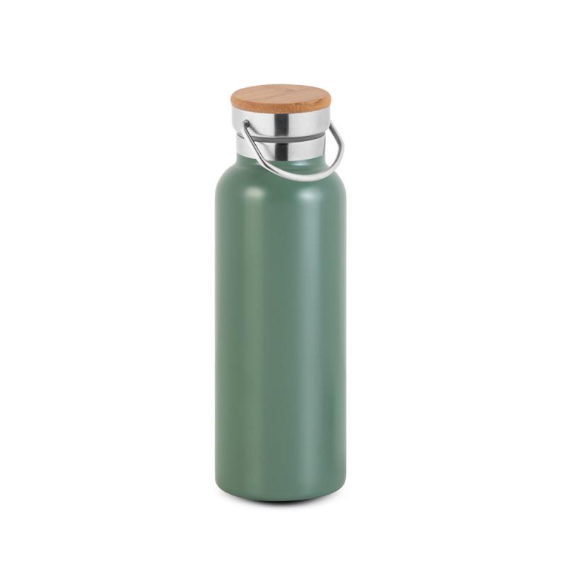 Botella de acero inoxidable con doble cuerpo y una capacidad de hasta 570 ml. Incluye una tapa de bambú y un asa de transporte de acero inoxidable. Se suministra en una caja de papel kraftRecipiente :