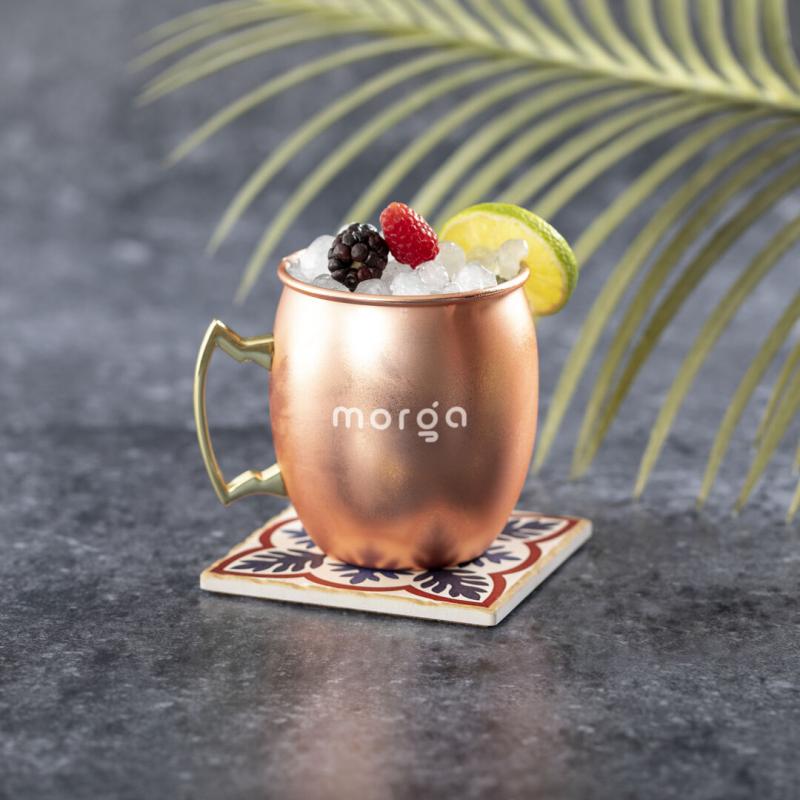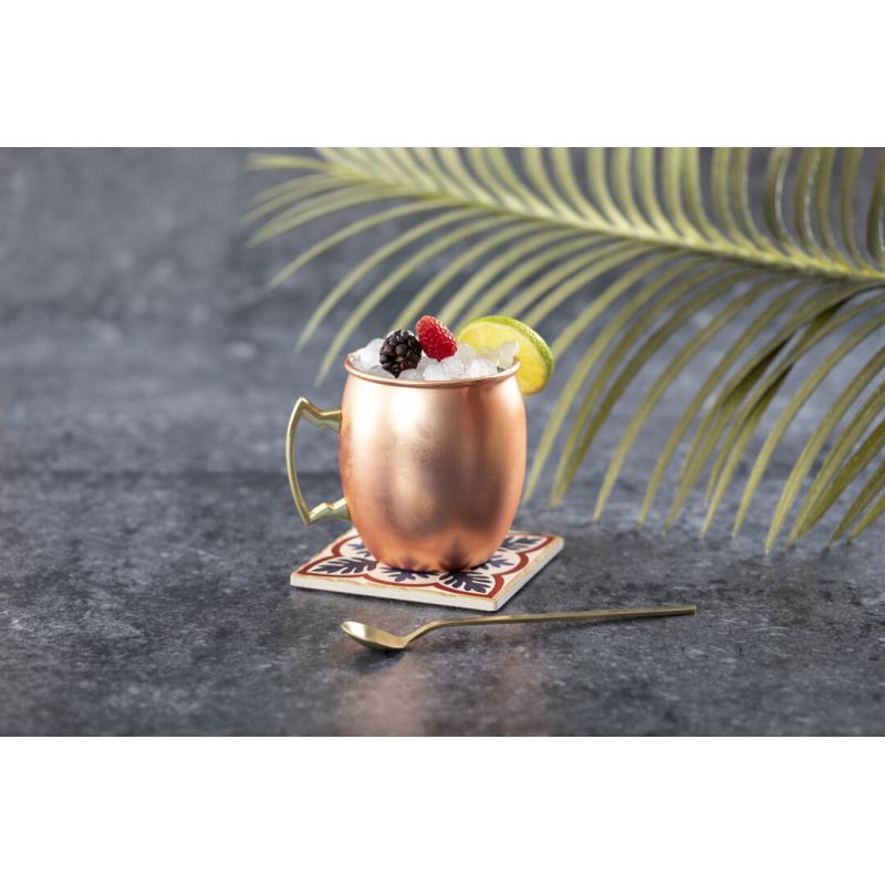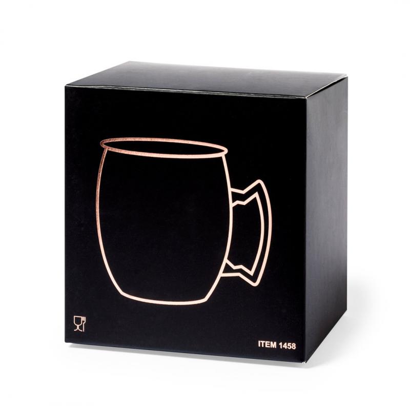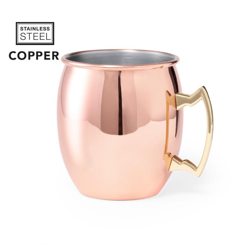 Taza de 500 ml de capacidad en acero inox con recubrimiento exterior de cobre galvanizado. Innovador diseño de asa y presentada en atractiva caja individual.