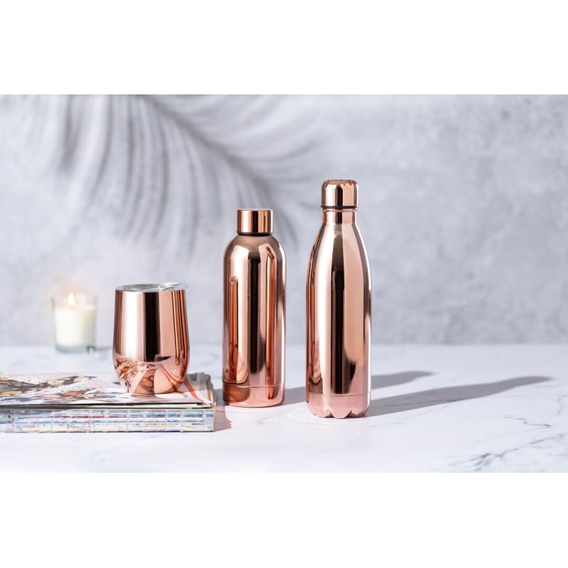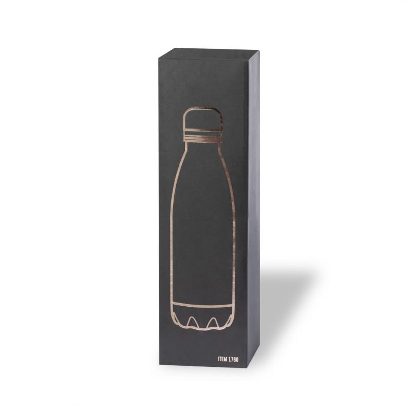 Bidón de 790 ml de capacidad, fabricado en acero inox y con recubrimiento exterior de cobre galvanizado. Tapón a rosca, libre de BPA. Presentado en caja individual negra de elegante diseño.