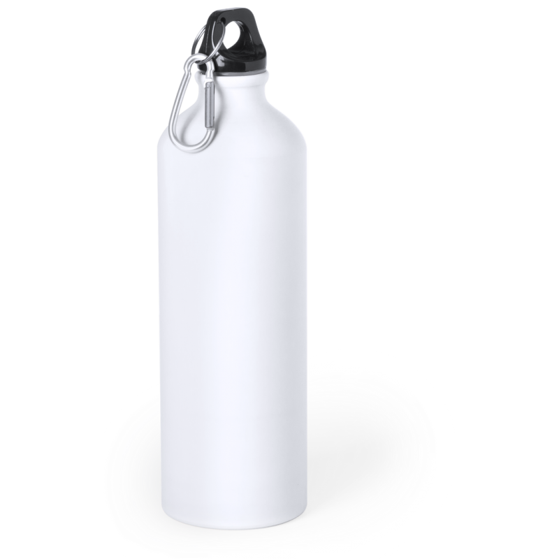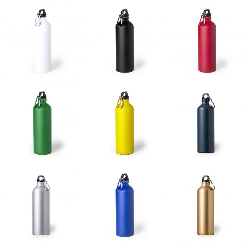 Bidón de aluminio con 800 ml de capacidad. Con tapón de seguridad a rosca y mosquetón metálico de fácil transporte. Original acabado mate y con una variada gama de colores. Presentado individualmente en una caja de diseño.