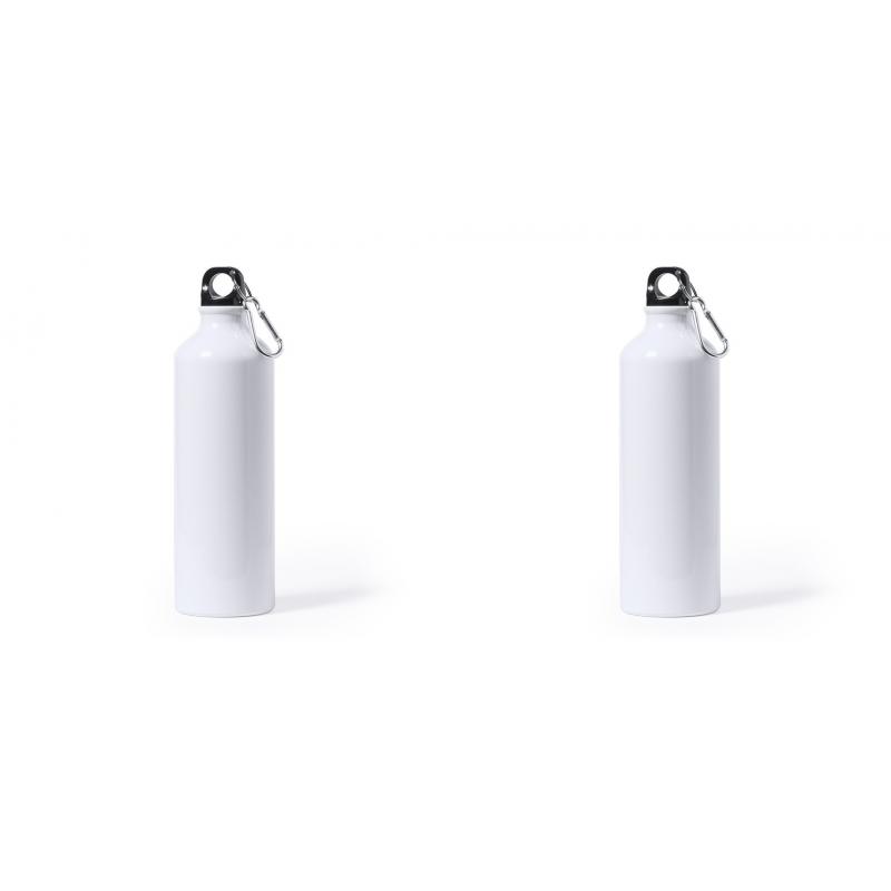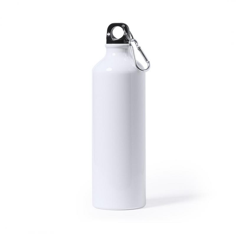 Bidón de aluminio de 800ml de capacidad. Acabado en suave y brillante color blanco, especialmente diseñado para marcaje en sublimación. Con tapón de seguridad a rosca y mosquetón metálico de transporte. Presentado en atractiva caja de diseño.