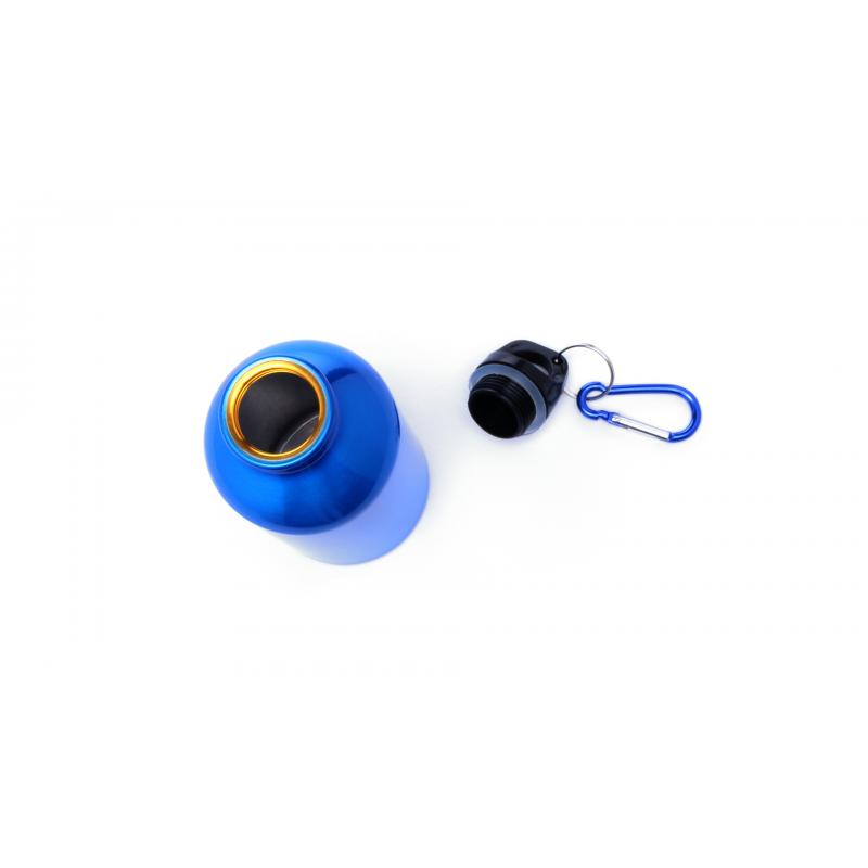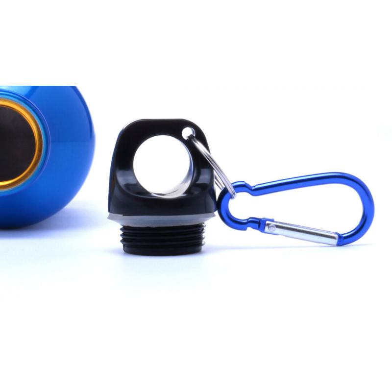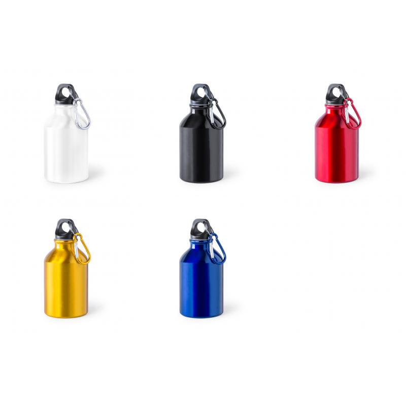 Bidón de 330ml de capacidad con cuerpo de acabado en aluminio en vivos y variados colores. Con tapón de seguridad a rosca y mosquetón metálico de transporte. Presentado en atractiva caja de diseño.