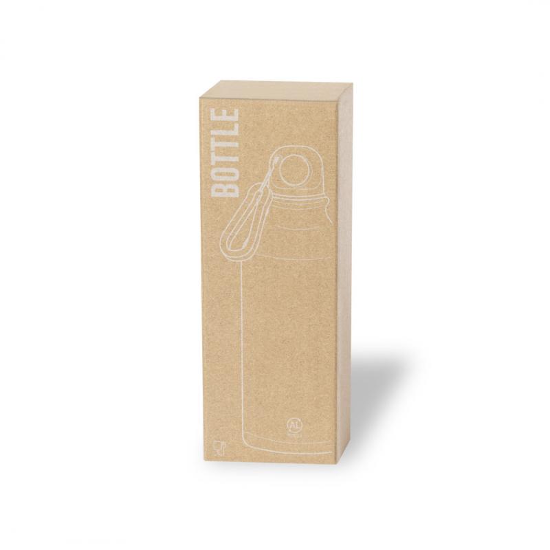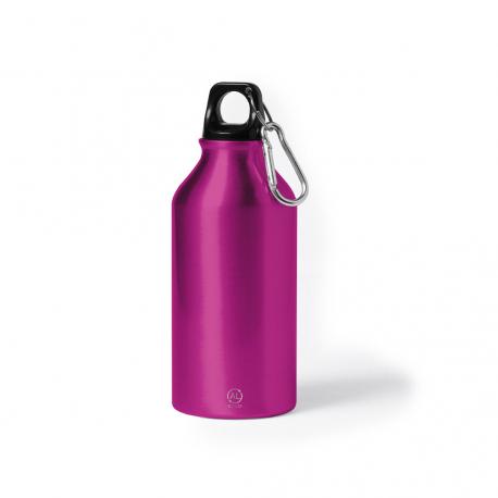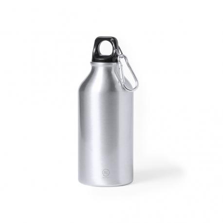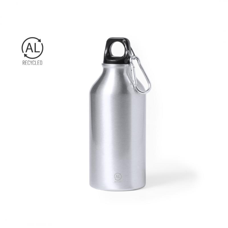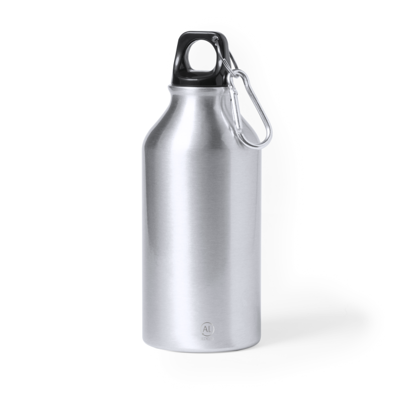 Bidón de 400 ml de capacidad. Fabricado en aluminio reciclado, con posibilidades de reciclaje casi infinitas, sin perder sus propiedades originales y consumiendo menos energía en este proceso. De acabado mate, con tapón a rosca en negro, anilla y mosquetón de transporte. Libre de BPA y presentado en caja individual de diseño kraft.