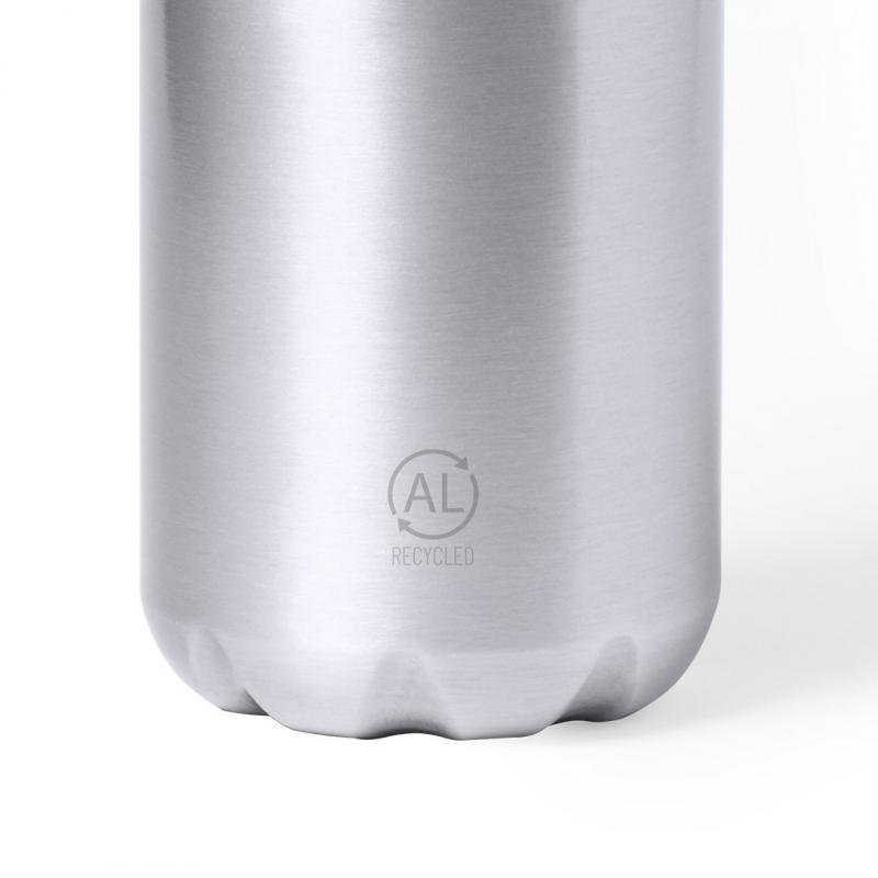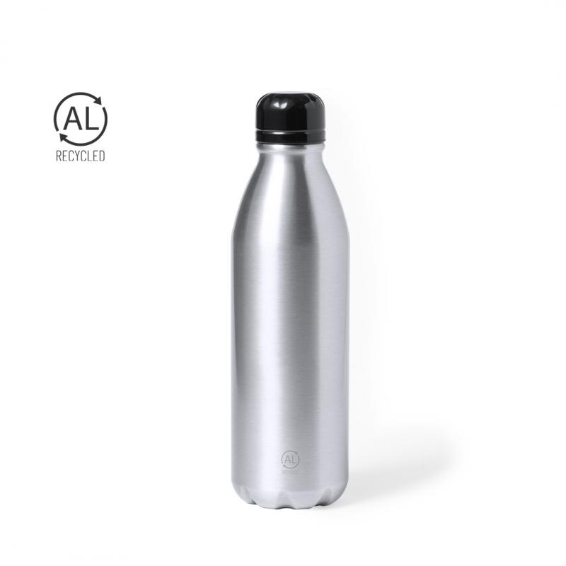 Bidón de 750 ml de capacidad. Fabricado en aluminio reciclado, con posibilidades de reciclaje casi infinitas, sin perder sus propiedades originales y consumiendo menos energía en este proceso. De acabado mate, con tapón a rosca en negro y libre de BPA. Presentado en caja individual de diseño kraft.