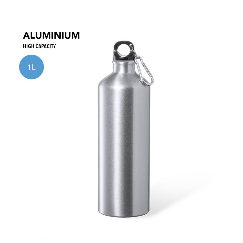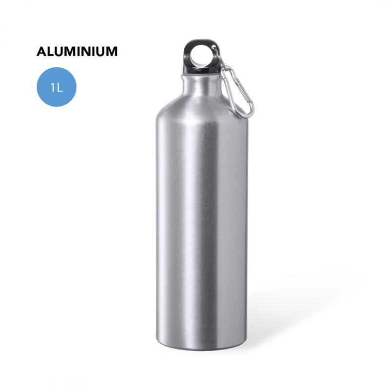 Bidón de 1 l de capacidad, fabricado en aluminio de acabado brillo. Tapón a rosca en negro, con anilla y mosquetón de transporte. Libre de BPA y presentado en caja individual de diseño kraft.