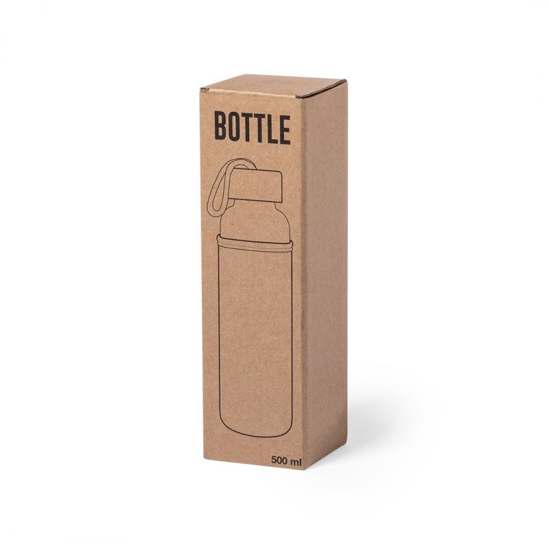 Bidón de línea nature en combinación de materiales bambú y cristal. 500 ml de capacidad, con tapón a rosca en bambú y funda en acabado de inspiración eco. Asa de transporte en color nature y presentado en atractiva caja de diseño eco.
