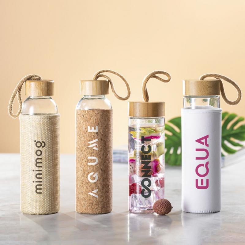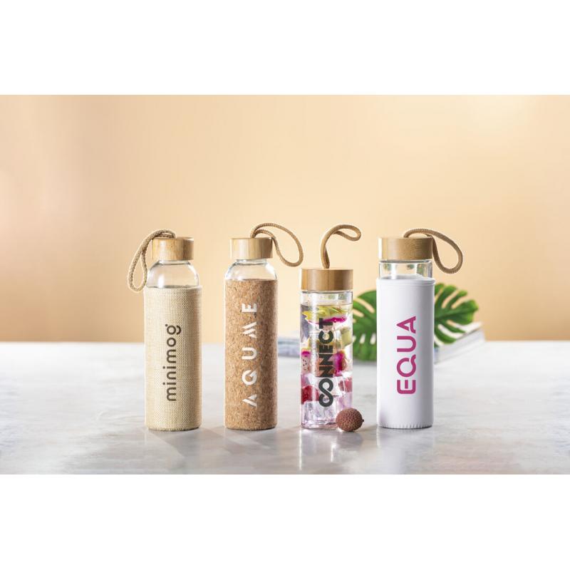 Bidón de línea nature de 500ml de capacidad. Fabricado con cuerpo de cristal y tapón a rosca de bambú, con práctica asa de transporte trenzada en color natural. Incluye funda de corcho natural y viene presentado en caja individual de atractivo diseño eco.