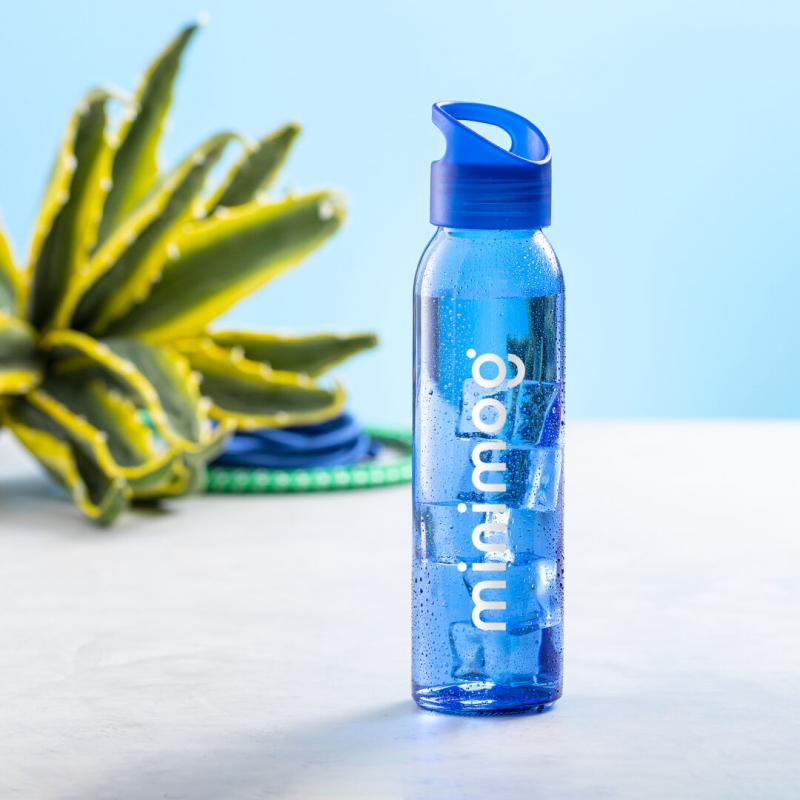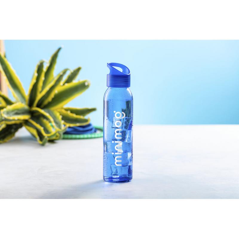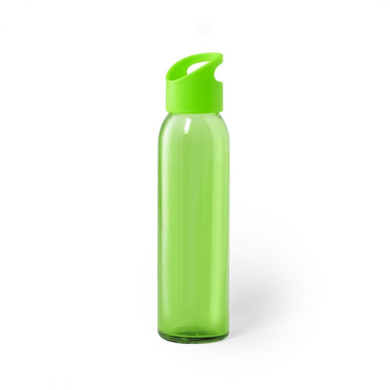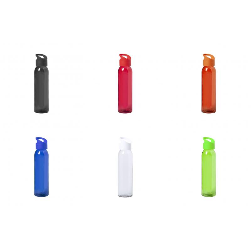 Bidón de 470ml de capacidad. Fabricado con cuerpo de cristal y disponible en variada gama de colores. Tapón a rosca en PP, libre de BPA, a juego. Presentado en caja individual de atractivo diseño.