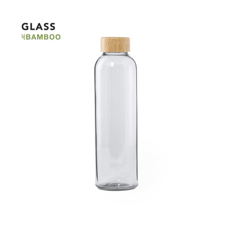 Bidón transparente de cristal de 500 ml de capacidad, con tapón a rosca en bambú y libre de BPA. Presentado en atractiva caja de diseño kraft.