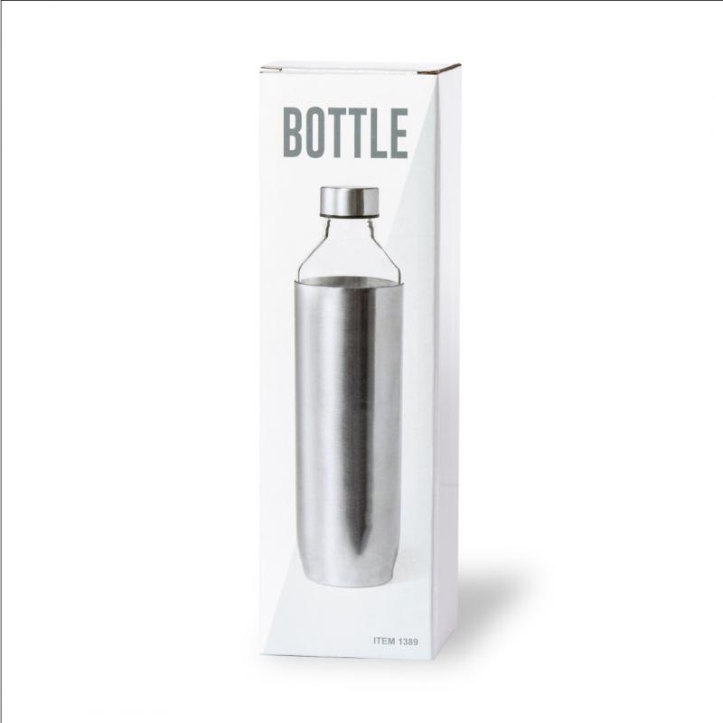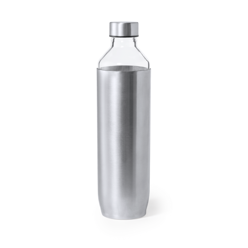 Bidón de diseño en alta calidad, de 850 ml de capacidad. Fabricado en cristal de borosilicato, que ofrece una resistencia, estética y durabilidad excepcionales, alargando su vida útil y pudiendo ser reutilizado infinidad de veces. Tapón y funda del cuerpo del bidón en acero inox. Presentado en atractiva caja de diseño.
