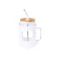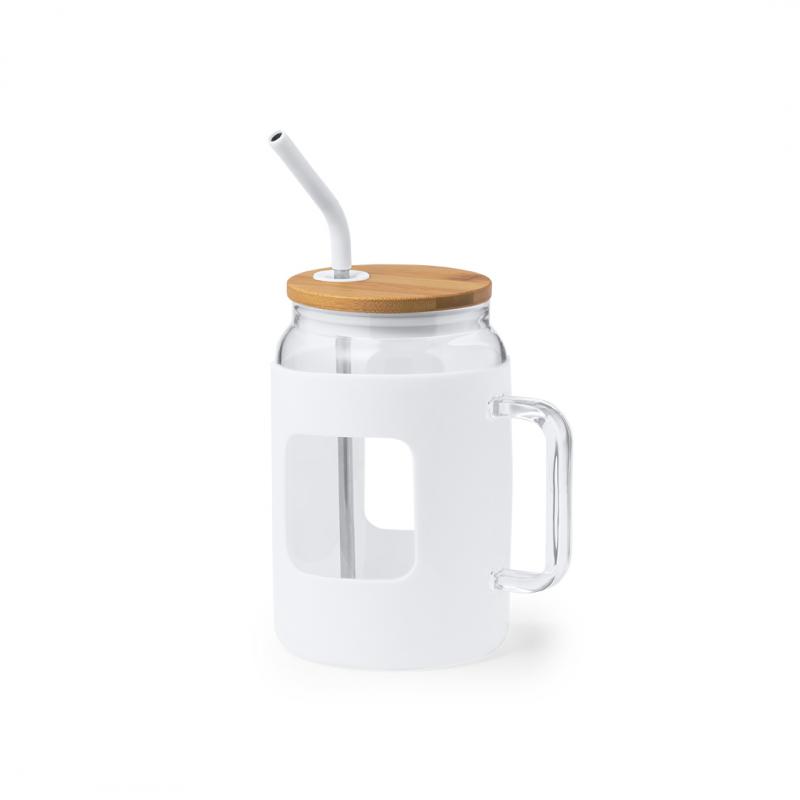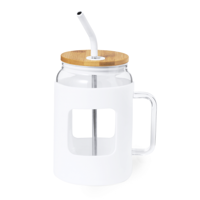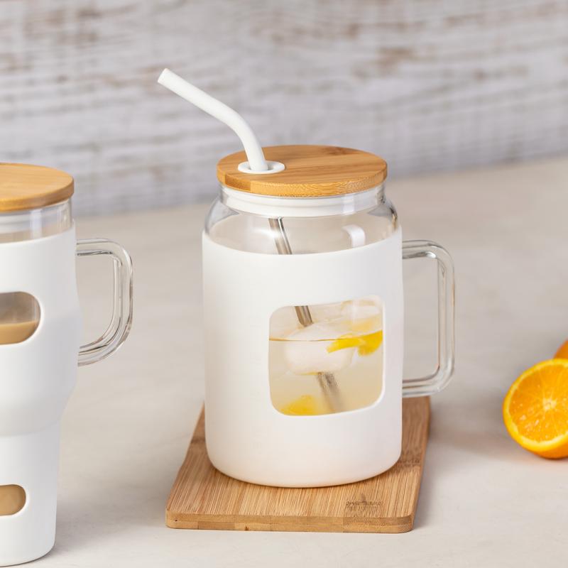 Tarro de gran capacidad (1,625 l) con cuerpo fabricado en resistente cristal, que ofrece una resistencia y durabilidad excepcionales, alargando su vida útil y pudiendo ser reutilizado infinidad de veces. Incluye asa para cómodo transporte y funda protectora en suave silicona. Tapa en bambú a presión, con orificio para pajita, y pajita reutilizable de acero inoxidable, con la punta recubierta en silicona para disfrutar de las bebidas de manera cómoda y segura.Presentado en caja individual de diseño kraft.