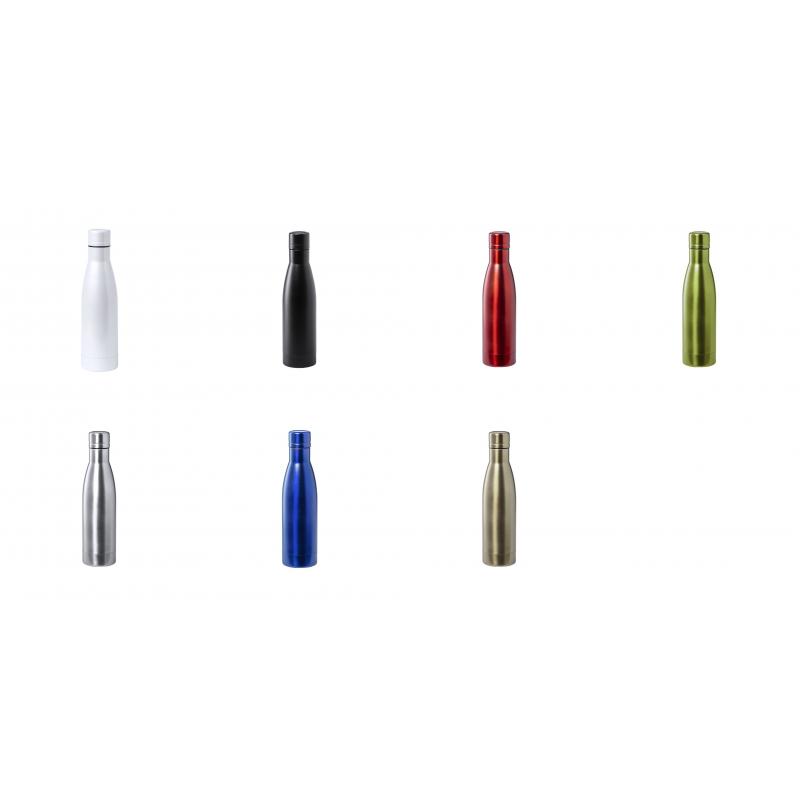 Bidón térmico de acero inox con doble capa de 500ml. Fabricado con doble capa y aislamiento de cobre al vacío, permitiendo mantener el calor y el frío durante un tiempo prolongado, llegando a las 12 y 48 horas respectivamente. Con tapón a rosca para un sellado perfecto. En acabado metalizado y disponible en amplia gama de colores. Presentado en atractiva caja de diseño.