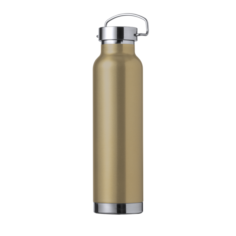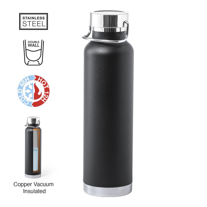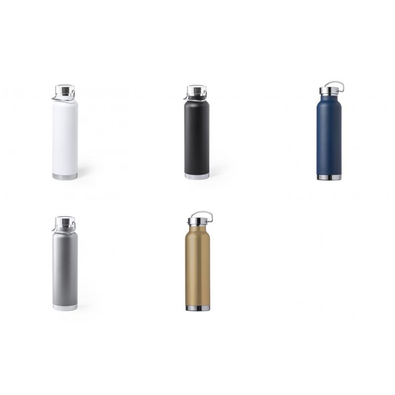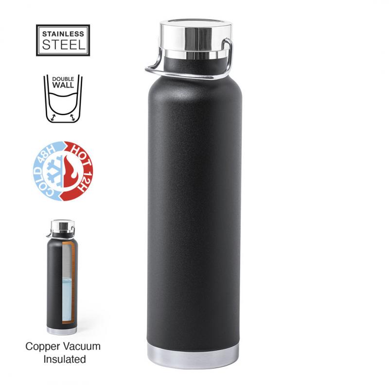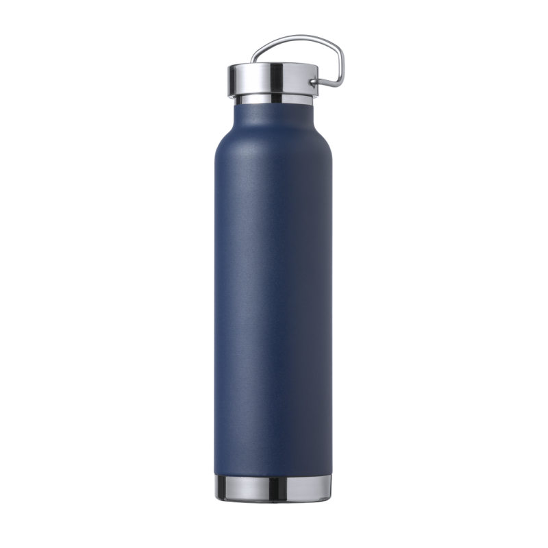 Bidón térmico de acero inox, con doble capa y aislamiento de cobre al vacío. El mismo le permite mantener el calor y el frio durante un tiempo más prolongado, llegando a las 12 y 48 horas respectivamente. De 650ml de capacidad, y disponible en variada gama de colores metalizados. Presentado en atractiva caja de diseño.