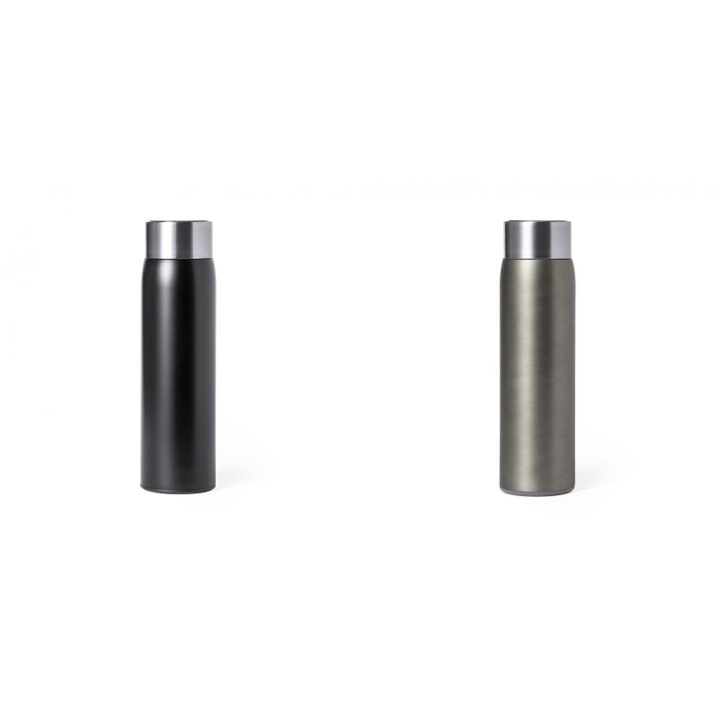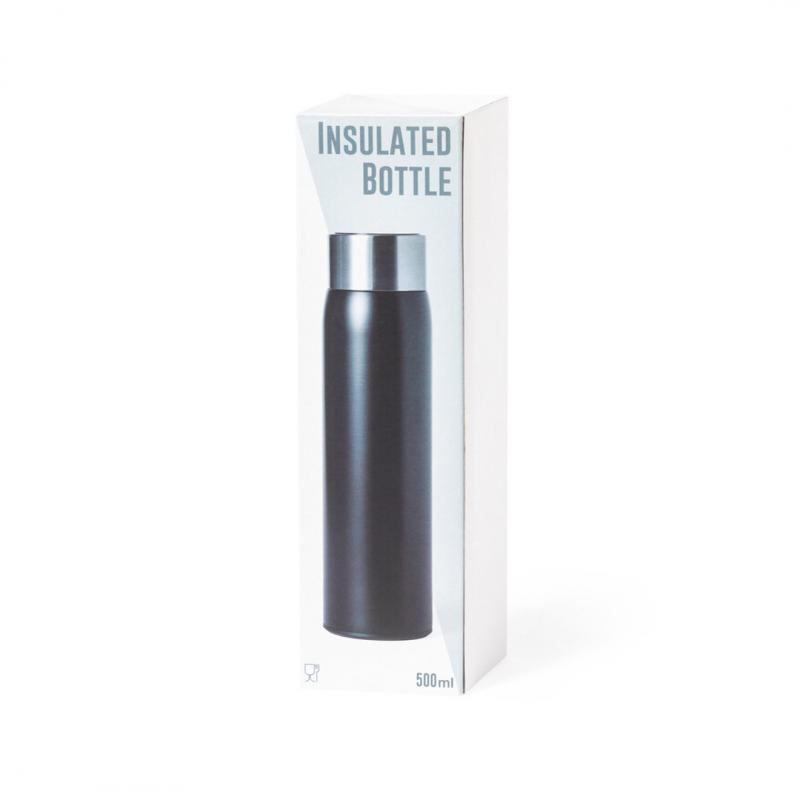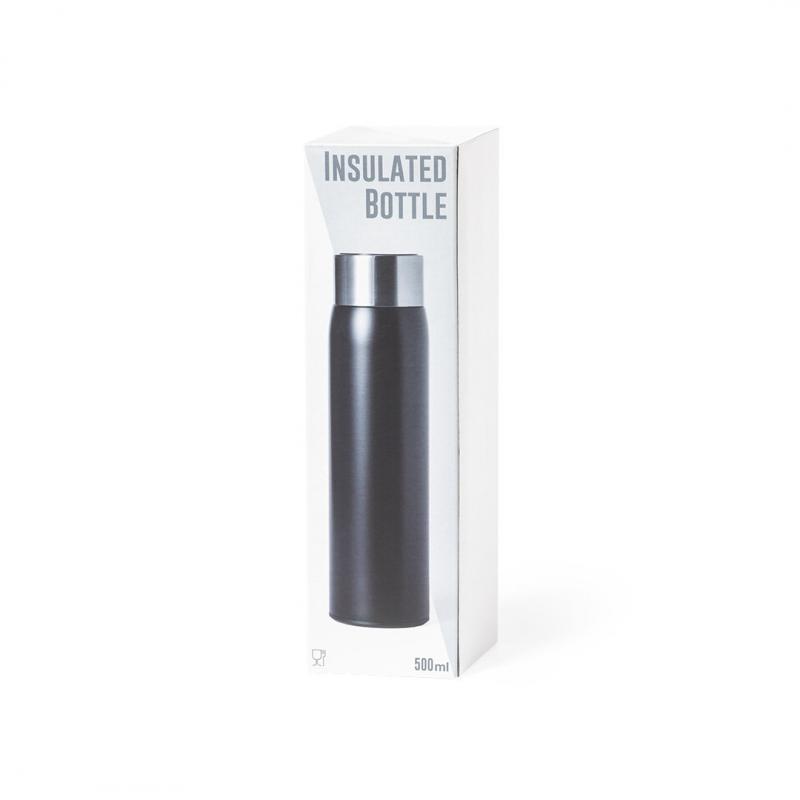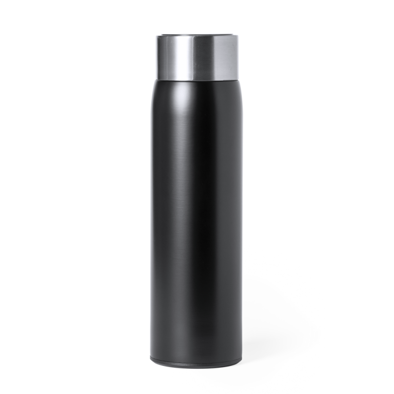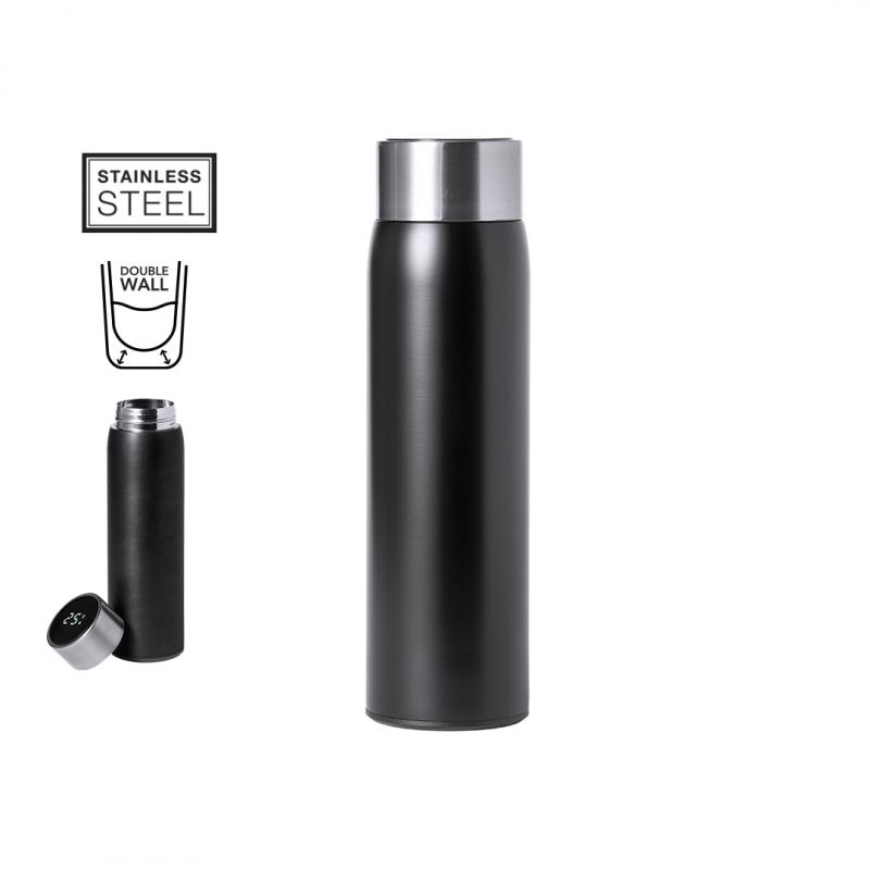 Bidón térmico de acero inox y doble pared, con medidor de temperatura táctil integrado en tapón. 500ml de capacidad y de acabado mate. Con tapón de seguridad libre de BPA y presentado en atractiva caja de diseño. Alimentación a pilas (de botón incluida) y disponible manual de instrucciones en español e inglés.