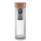 Botella de cristal (vidrio de borosilicato) de doble capa. Tapa de bambú con infusor de té. Capacidad: 420 ml. Como el bambú es un material natural, el color por artículo puede variar. Anti fugas. El grabado a láser no es posible en el vidrio de borosilicato.
