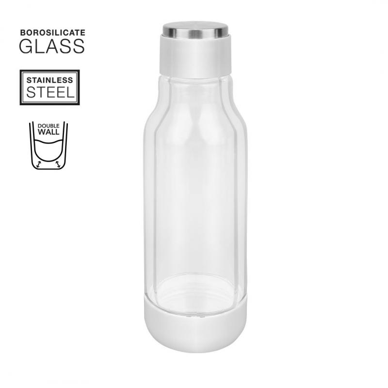 Bidón térmico de doble capa, de original diseño en alta calidad y de 500 ml de capacidad. Fabricado en cristal de borosilicato, que ofrece una resistencia, estética y durabilidad excepcionales, reduciendo así el consumo de productos de usar y tirar. Innovador cuerpo transparente que permite ver el interior en combinación con color blanco, fabricado con materiales de alto poder aislante. Presentado en atractiva caja de diseño.