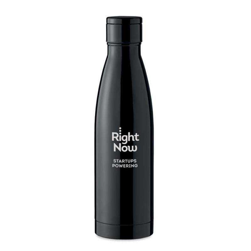 Botella de acero inoxidable de doble pared. Dispone de un termómetro LED táctil incorporado en la parte superior de la tapa. Funciona con pila recargable CR 2032 incluida. Anti fugas. Capacidad: 500 ml.