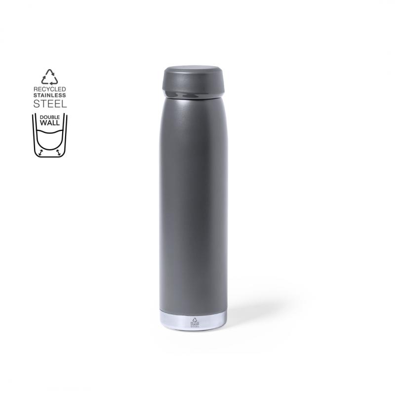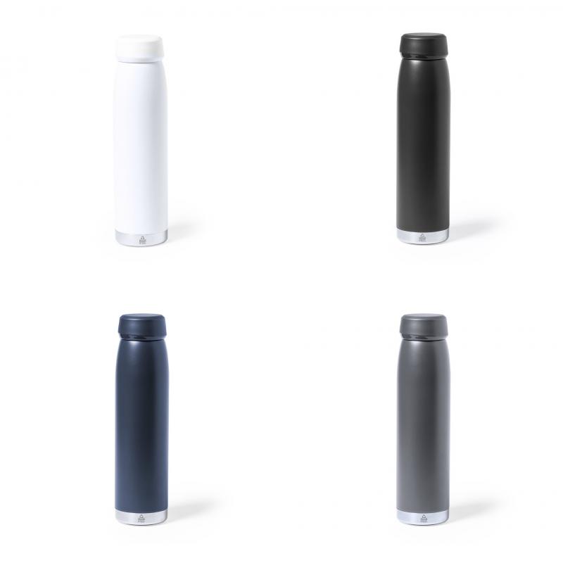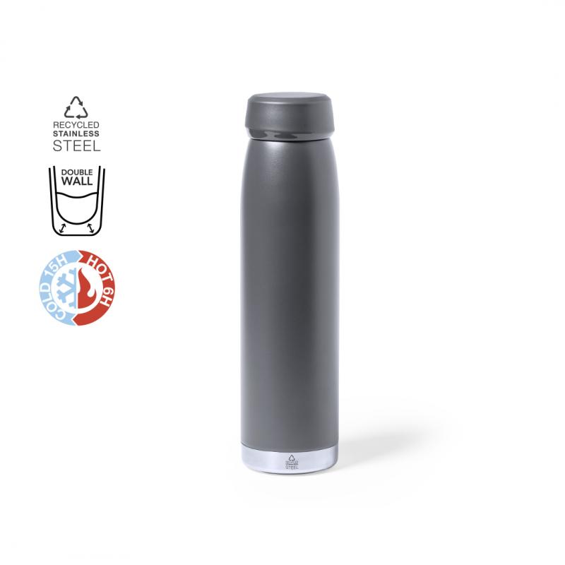 Bidón térmico de 380 ml de capacidad, fabricado en acero inox reciclado de doble pared, con tapón a rosca a juego y base en plata. Disponible en variada gama de colores satinados, libre de BPA y presentado en caja individual de diseño kraft. El acero es uno de los materiales más demandados y que puede encontrarse casi en todas partes, desde productos de uso diario a grandes construcciones. Con innumerables propiedades, entre las que cabe destacar la durabilidad y su alto grado de reutilización, convirtiéndolo en una alternativa muy valorada en soluciones de sostenibilidad. Debidamente tratado, permite obtener nuevos recursos de infinita utilización.