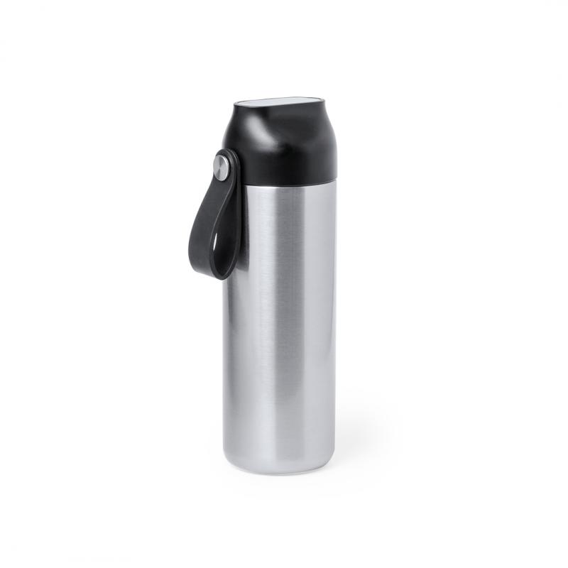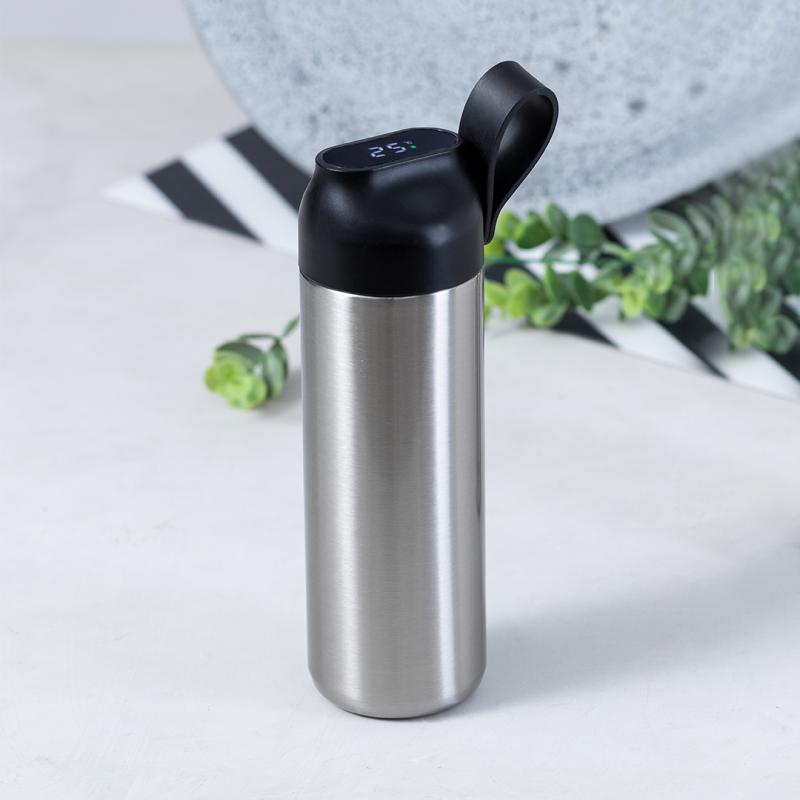 Bidón térmico de acero inox y doble pared de 630 ml de capacidad, con medidor de temperatura táctil en tapón y asa integrada. Con tapón de seguridad libre de BPA y presentado en atractiva caja individual de diseño Kraft y en bolsa reciclada. Alimentación a pilas (de botón incluida), con manual de instrucciones disponible en español e inglés.