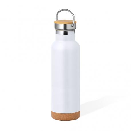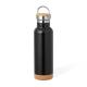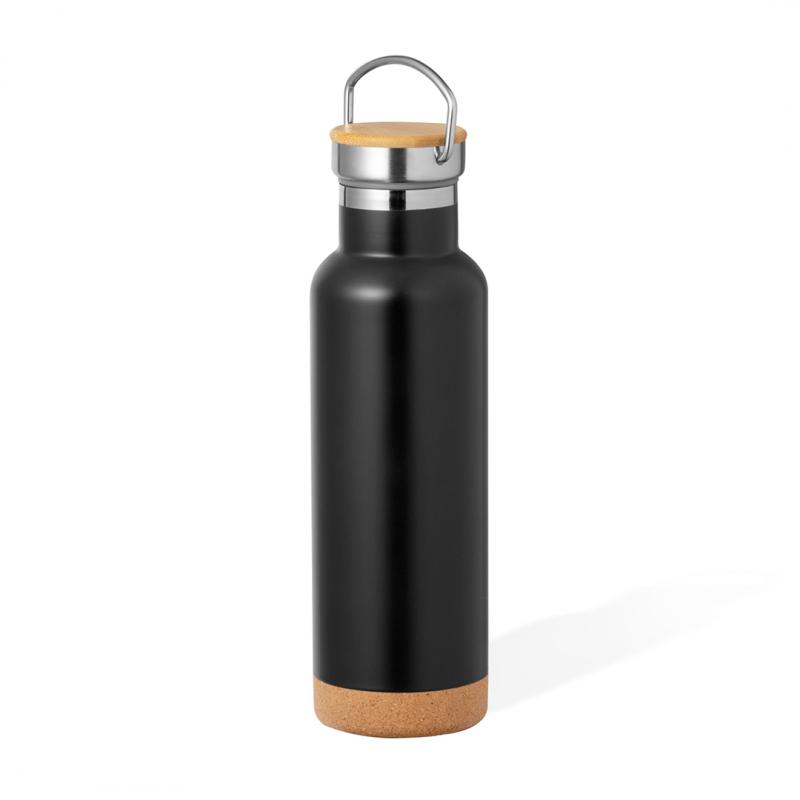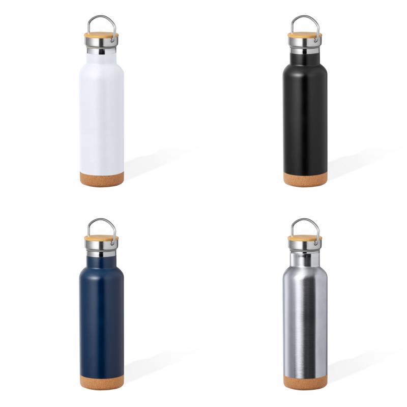 Bidón térmico de 650 ml de capacidad, fabricado en acero inox de doble pared. Incluye original tapón a rosca en acero inox, con detalle de bambú y asa integrada, y con original base de corcho. Disponible en variada gama de colores y presentado en caja individual de diseño kraft.