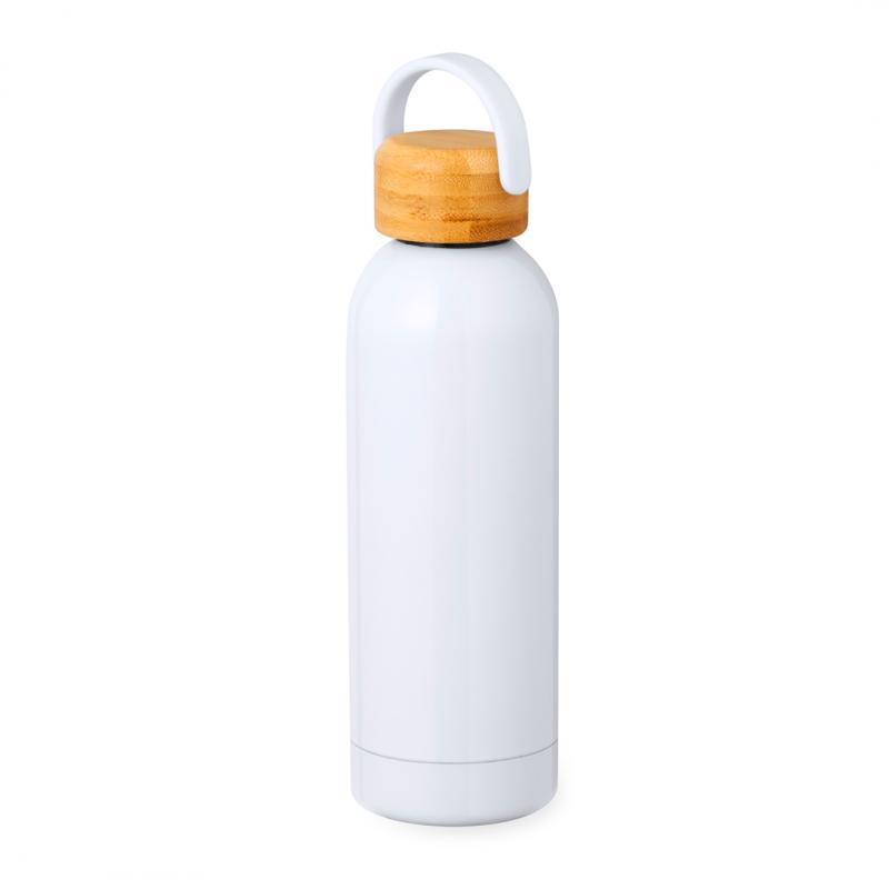 Bidón térmico de 500 ml de capacidad, fabricado en acero inox de doble pared y especialmente diseñado para marcaje en sublimación. De acabado blanco brillo, con tapón a rosca y asa superior para un fácil agarre, libre de BPA. Presentado en caja individual de diseño kraft.